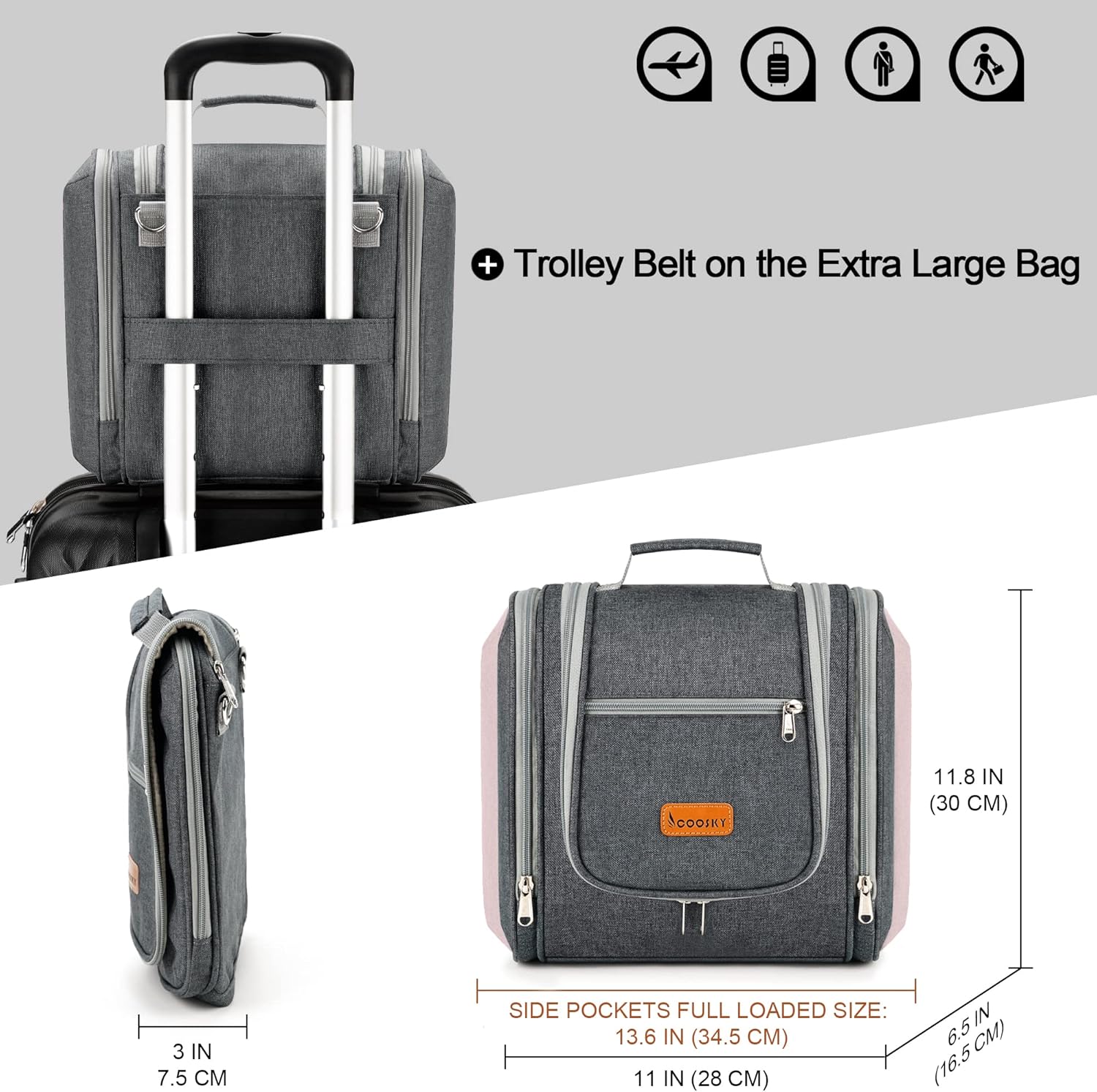 - CONSIDERABLE DESIGN - The elastic band and elastic mesh bag in the main compartment and two side compartments can keep the bottle fixed and upright. It has two waterproof compartments specially used for storing wet items. You can put your wet towel, toothbrush, shaving kit, and leaky cosmetics in it. The 360 degrees rotate metal hook gives you a variety of hanging options.