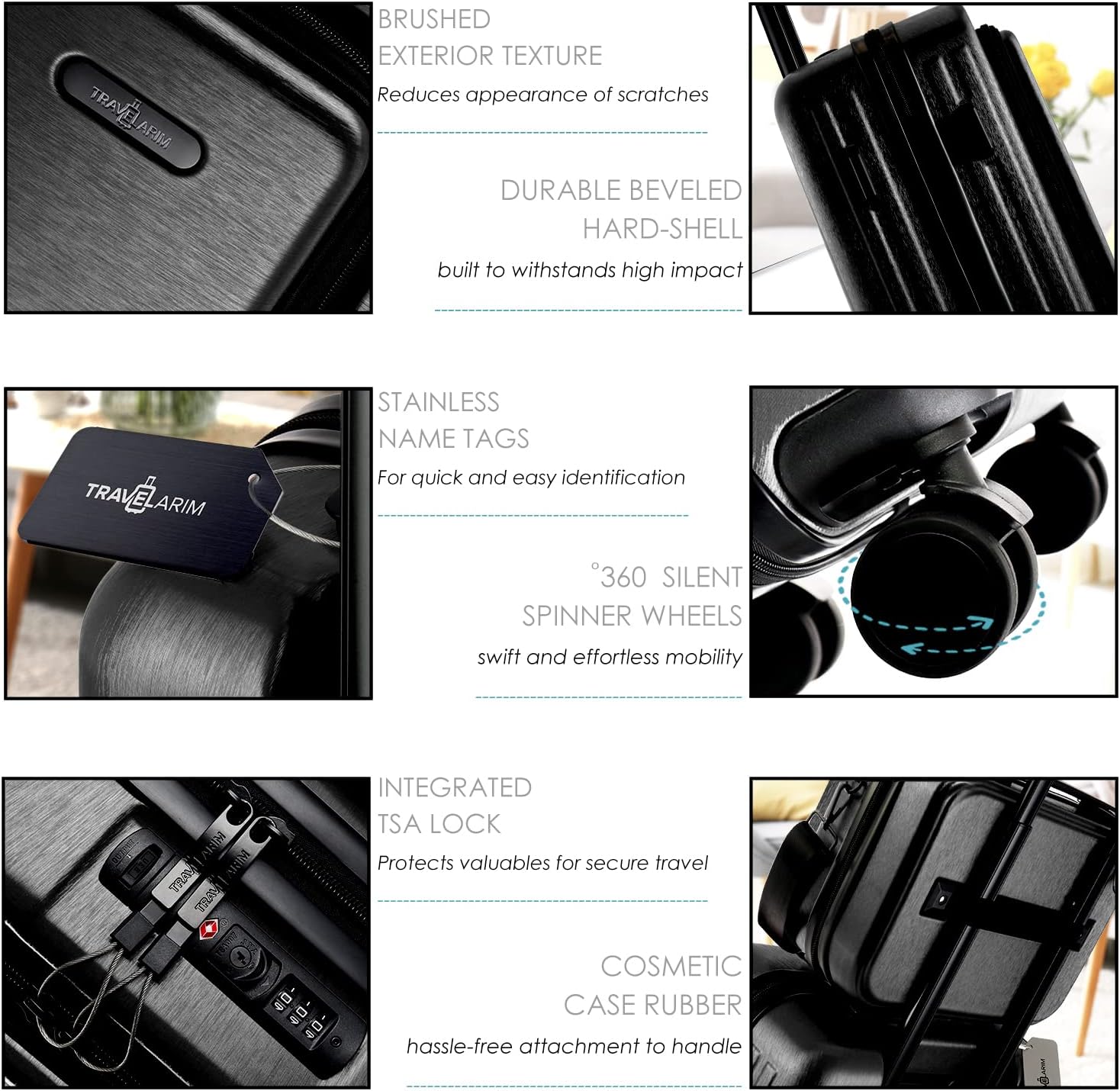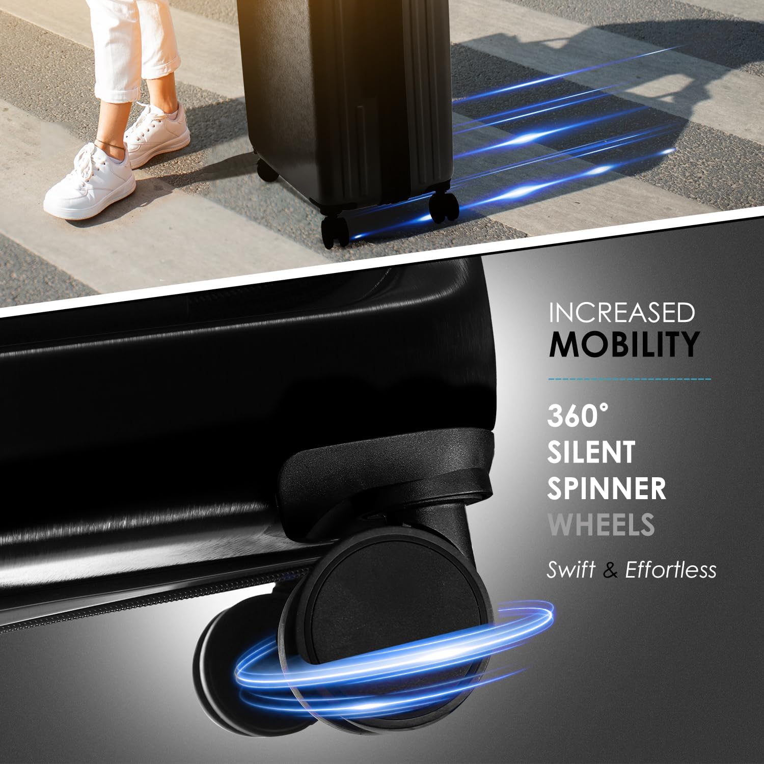 - Carryon Luggage with Spinner Wheels: Rolling carry on luggage for plane travel includes 4 spinner wheels that provide you with smooth, gliding 360 movement, a telescoping handle, stainless steel name tags, and TSA lock to secure your belongings.