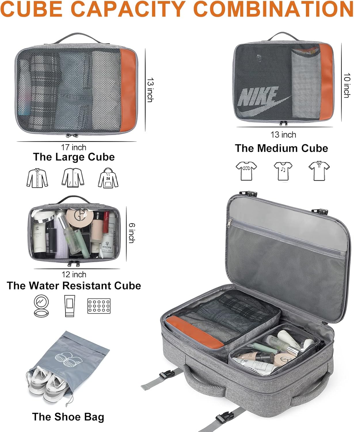 - EXTRA 4 PACKING CUBES:This weekend travel backpack comes with four packing cubes. large cube for sweaters, jackets, pants. Medium cube for shirts, shorts. Small water resistant cube with transparent side for providing clear overview of toiletries. there's also a shoe pocket. Keeping your belongings neater and more organized. Serve you well as carry on bags for airplanes, weekender backpack, personal item travel bag, overnight bag.