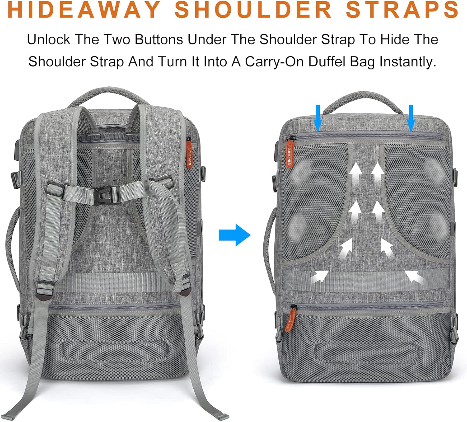 - DESIGNED for TRAVEL:The luggage backpack is constructed to be most comfortable over hours of carrying, with multi-panel ventilated padding and adjustable and breathable straps which relieve the stress of the weight on your shoulders. Equipped with an adjustable chest strap, provides a better wearing experience. A luggage strap to attach the backpack to your suitcase. An anti-theft back pocket is suitable for valuables. Features a USB port, which means you can charge your phone on the go.