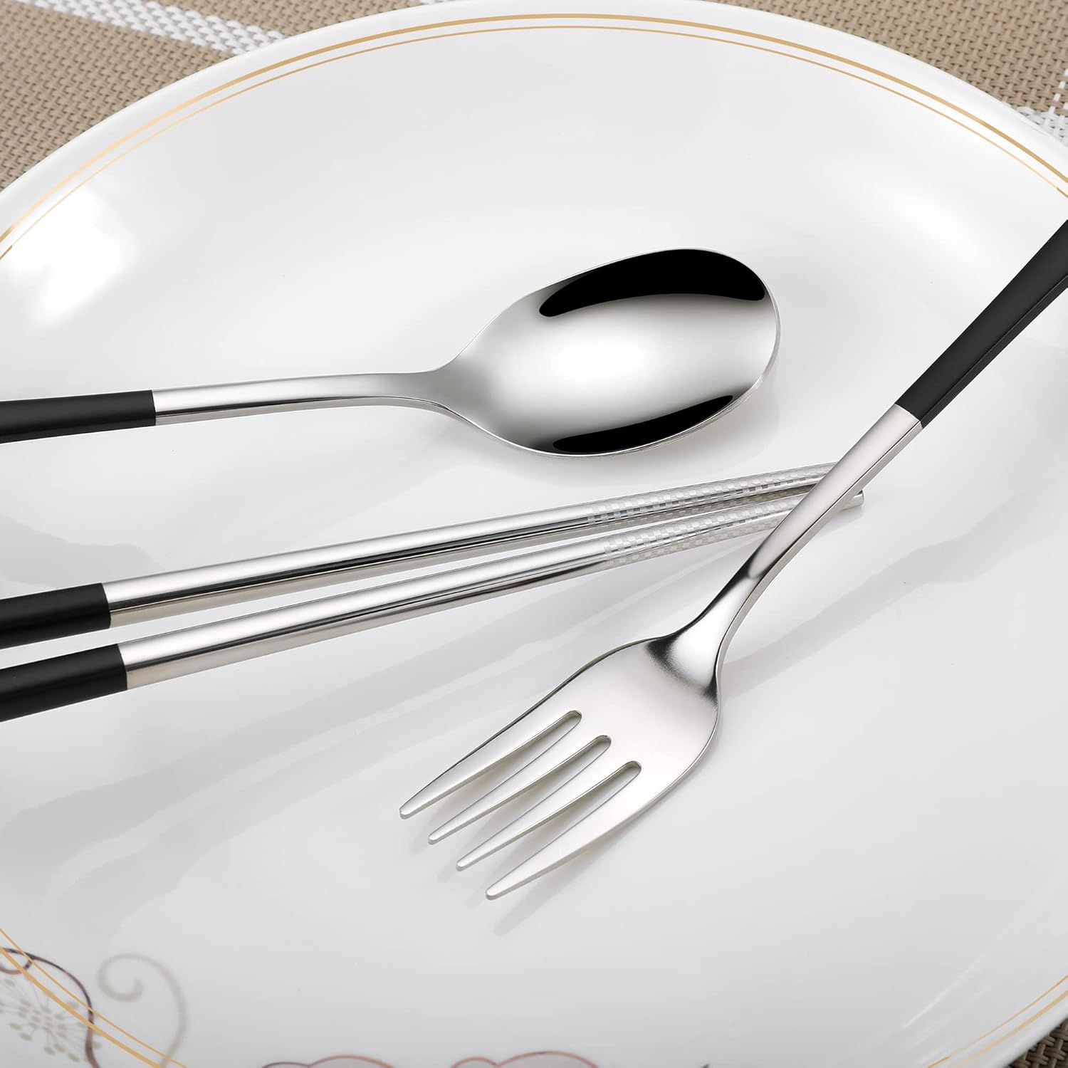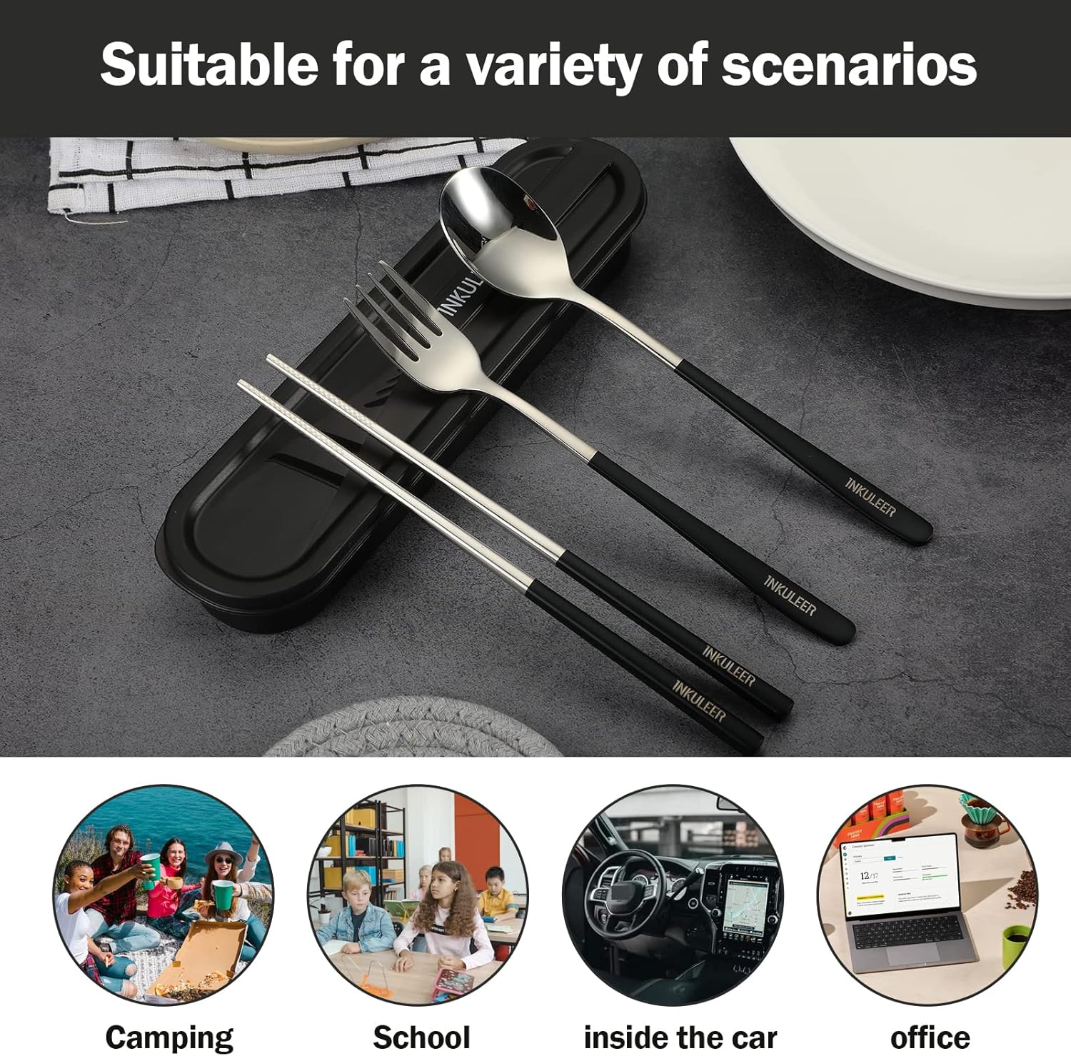 - Each set of travel cutlery includes 1 pair of chopsticks, 1 spoon and 1 fork,