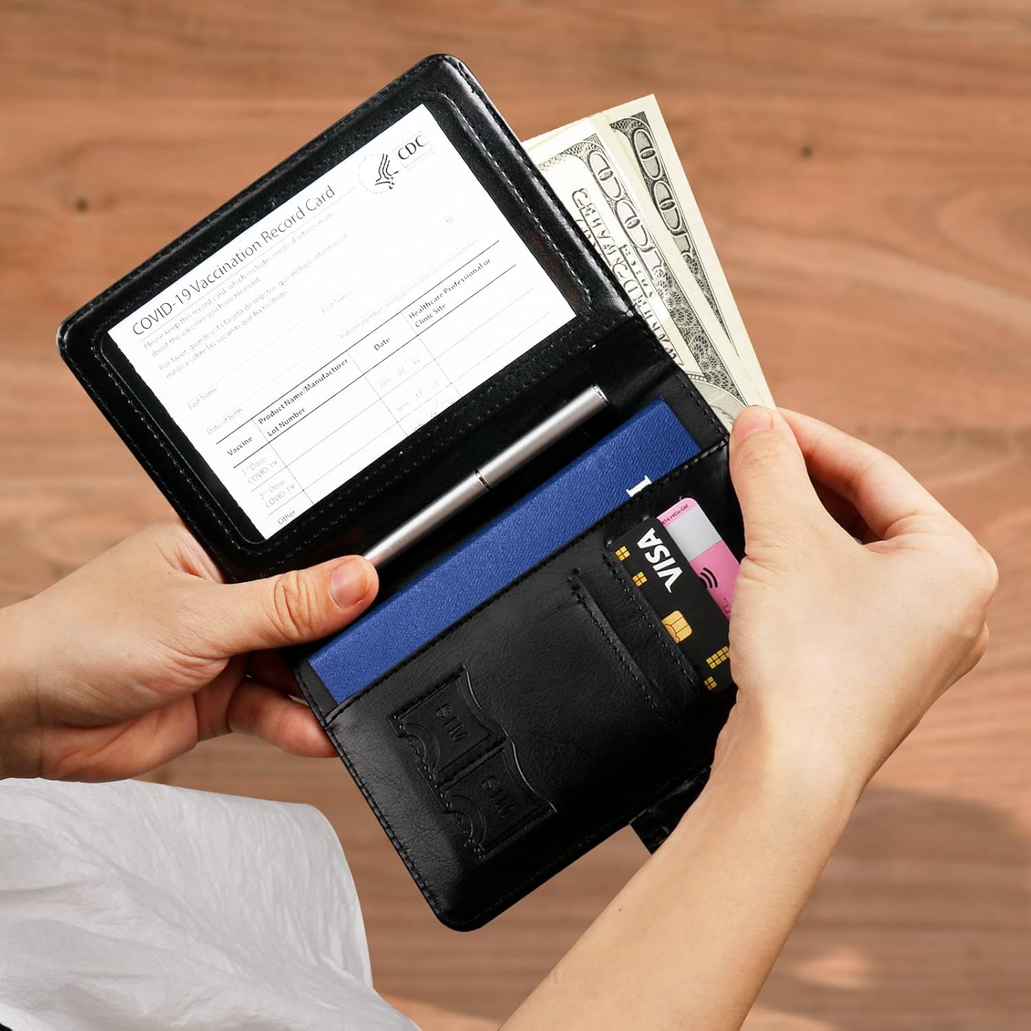 - Upgraded Passport Wallet: Passport cover Internal clear slot can be used to store photos, vaccine card, etc.. Side opening can be used as a travel wallet to store cash. There is also a dedicated card slot inside the card holder for storing ID cards, driver's licenses, credit cards, SIM cards, etc. Our passport case also comes with a rotating metal pen, which is convenient for you to fill in the relevant information when you transit.