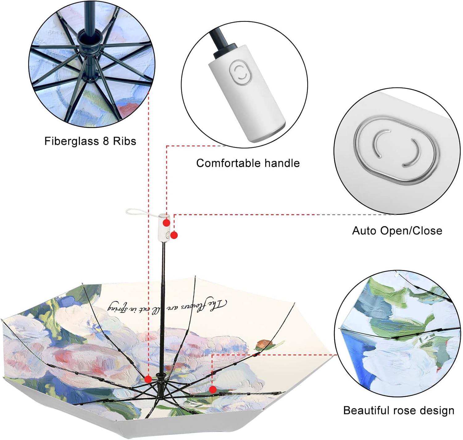 Cuby UV Sun Umbrella Compact Folding Travel Umbrella Auto Open and Close for Windproof, Rainproof & 99.9% UV Protection Parasol with Silver Anti-UV Coating (Silver Rose)