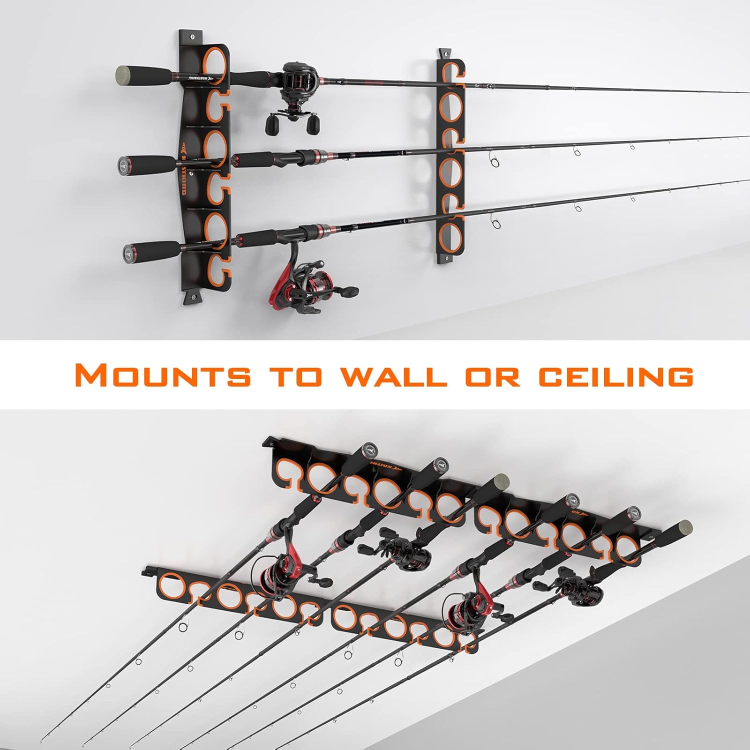 - INNOVATIVE DESIGN – This innovative fishing rod rack is simple and easy to use, and it can be mounted on a wall or on the ceiling. Simply insert the butt of the rod into one of the holes and guide the tip end through the opening on the opposite rack for secure storage. Combos can be installed in opposite directions to allow space for the reels without interfering with other combos on the rack.