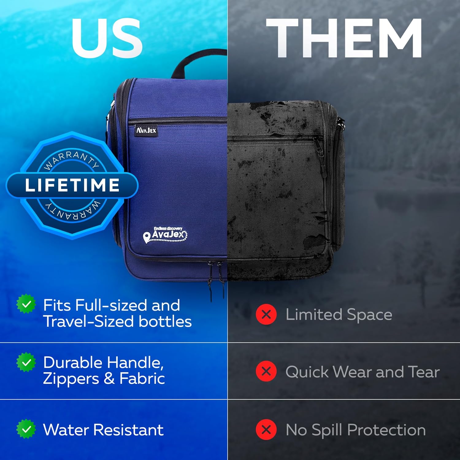 - VERSATILE TRAVEL BAG FOR TOILETRIES: Compact, lightweight and made of premium polyester with no smell and an easy to clean lining, this large toiletry bag is a keeper! Plus, it will save you the mess of spilled liquids on your clothes in your luggage, thanks to its 100% waterproof inner lining! guaranteed.