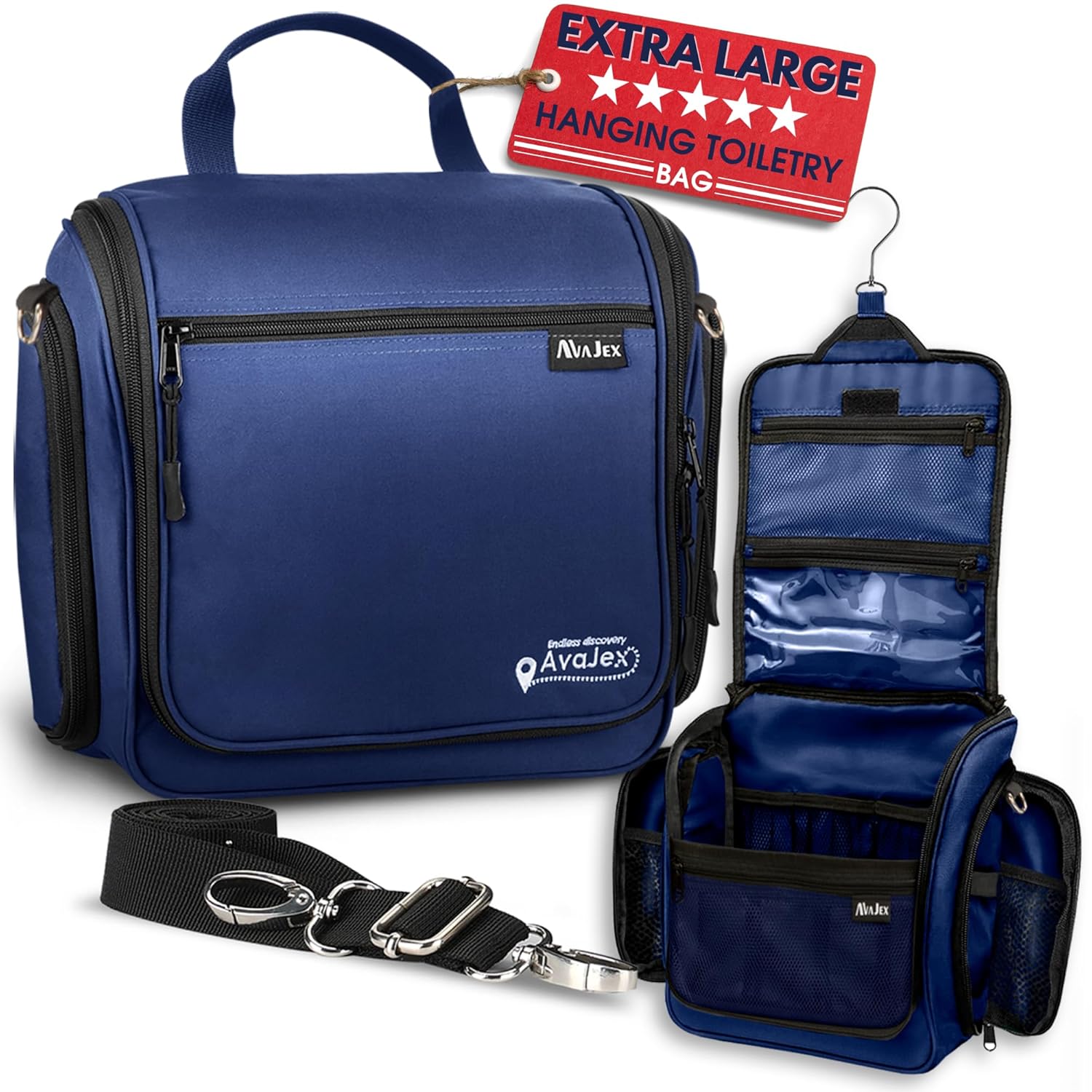 Extra Large (11.8”x11.8”x4”) Hanging Travel Toiletry Bag for Men and Women - Cosmetic Travel Bag With Shoulder Strap - Waterproof Hygiene Bag with Metal Swivel Hook and 19 Compartments for Toiletries