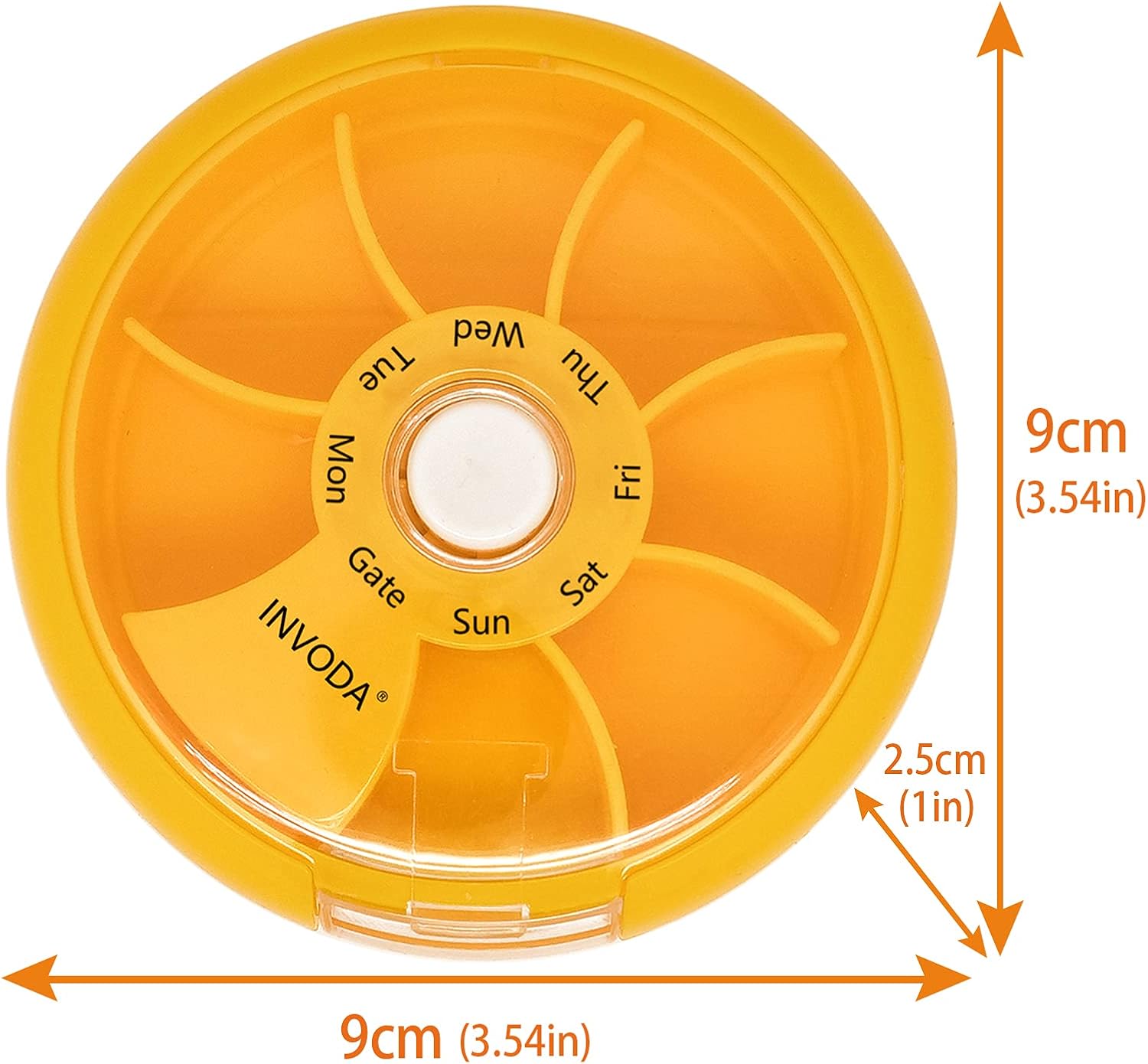 INVODA Weekly Pill Organizer 7 Compartment Rotating Pill Box for Daily Medication & Vitamins - Portable Travel Pill Case Fish Oil Supplements Vitamins Organizer (Orange+Bag)