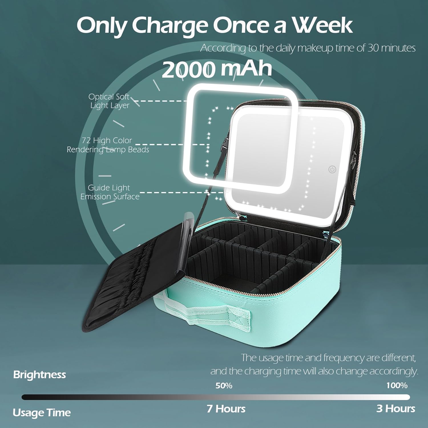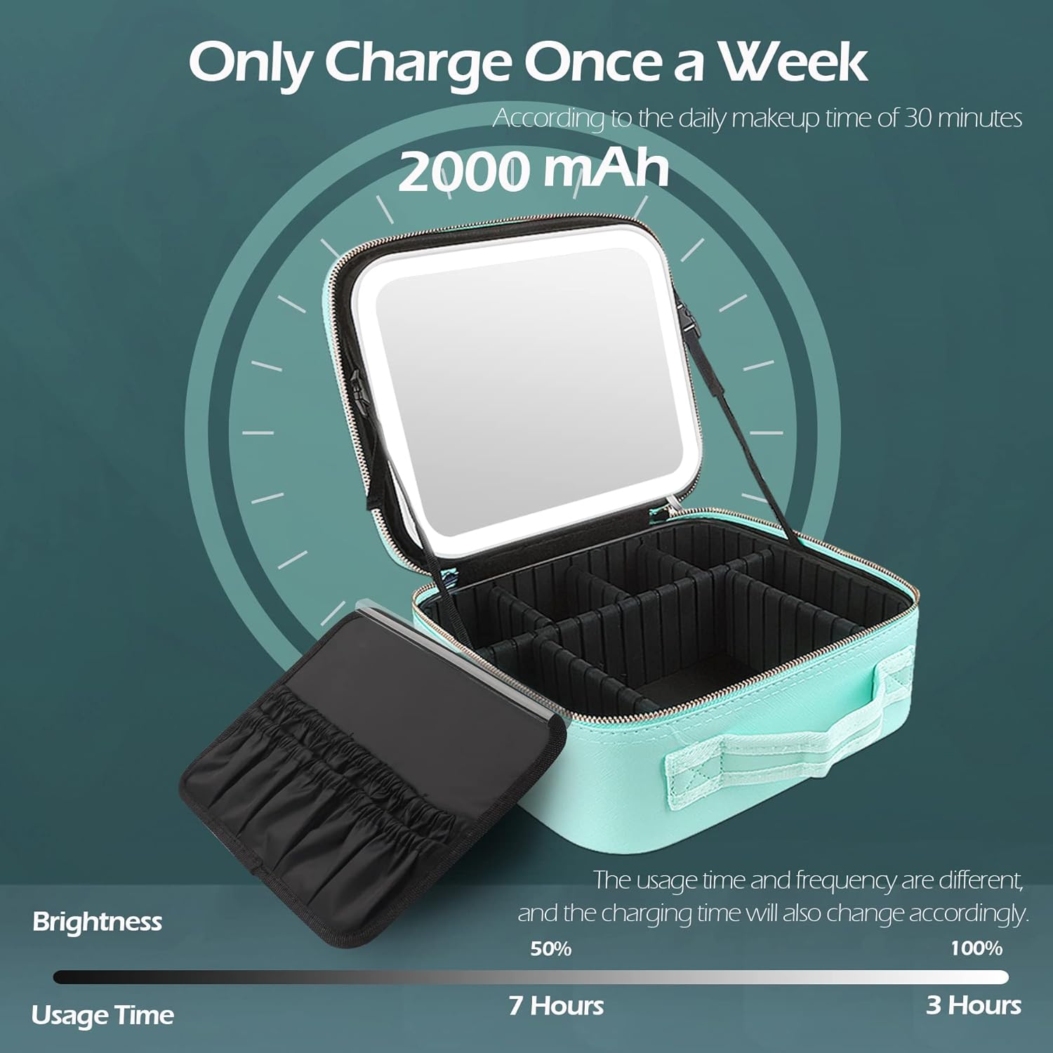 MOMIRA Travel Makeup Bag Cosmetic Bag Makeup Organizer Bag with Lighted Mirror, Adjustable Brightness in 3 Color Scenarios, Waterproof Makeup Train Case, Gift for Women - Green