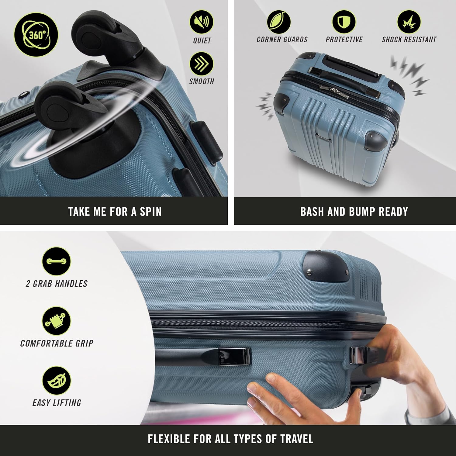 - 4-WHEEL, 360-DEGREE SPINNERS provide smooth, quiet, and effortless maneuvering.