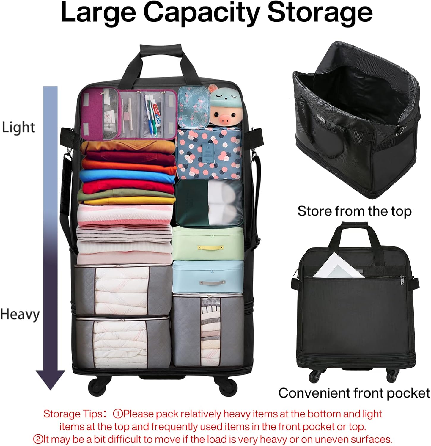 - FOLDABLE: Quality collapsible rolling duffel bag folds down to a compact 19" x 11" x 5" easy-to-store pouch when not in use.