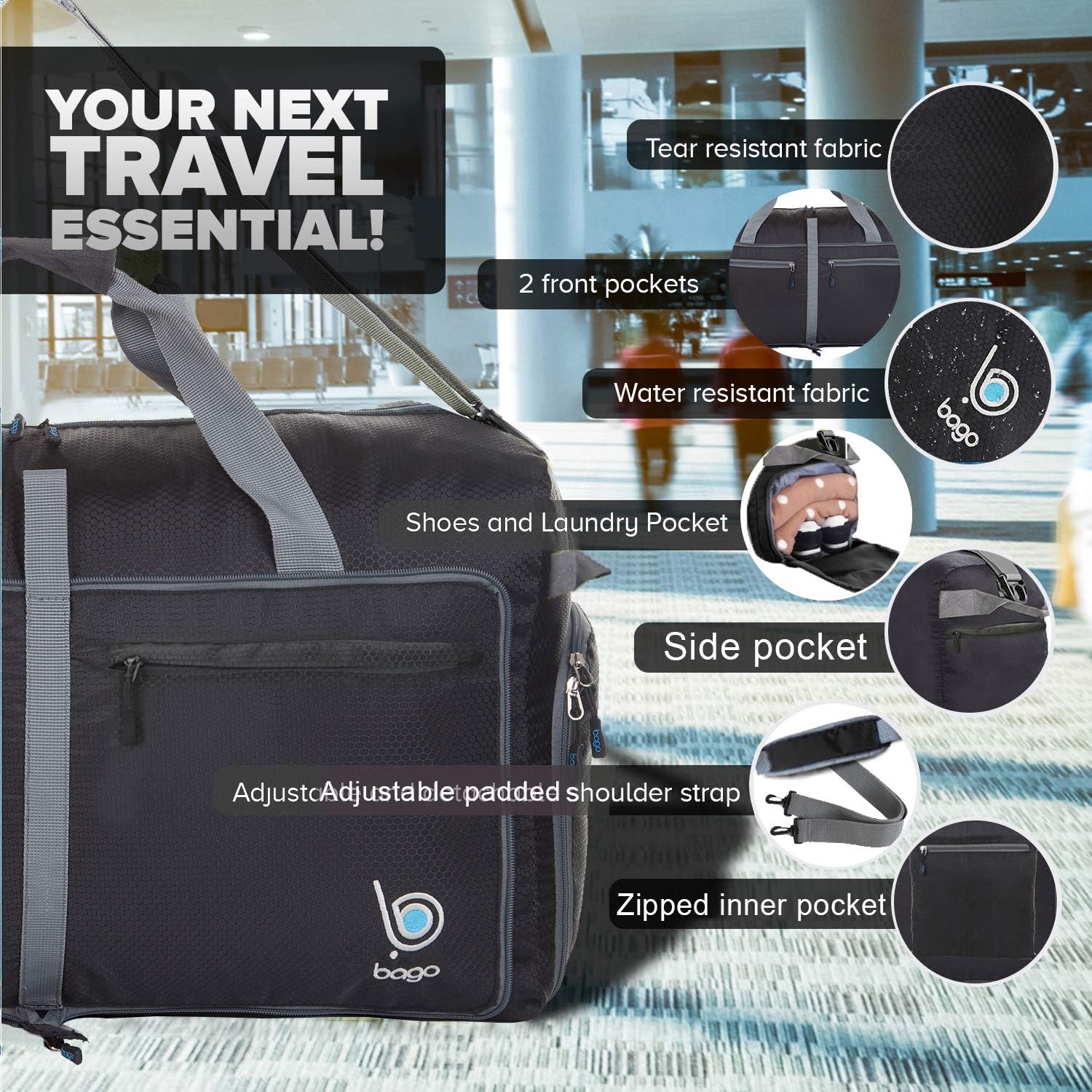 - DURABILITY: Sports bag, football duffle bag with shoe compartment, multiple zipped pockets and huge main compartment. Extra Large Travel Duffel bags for traveling, Travel bags for women, Hospital Bag or as foldable duffle bag large size in the car.