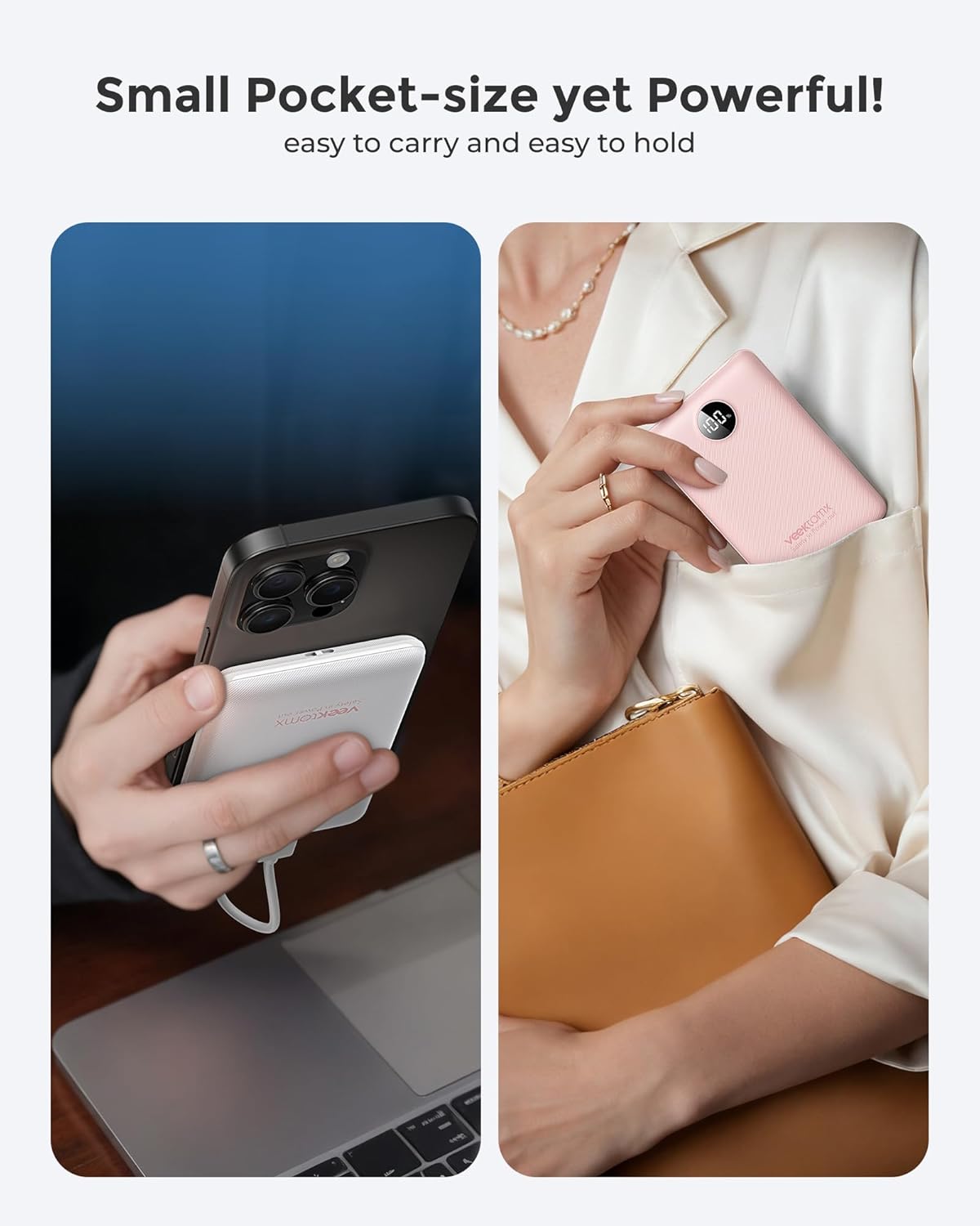 - [ Compact & Lightweight External Power Bank ] VEEKTOMX mini power bank packs 10,000 mAh capacity into a remarkably compact and lightweight design. Measuring just 4.2 x 2.7 x 0.6 inches and only 5.8 oz. Easily slips into your pocket, purse, wallet, or backpack, making it the perfect travel must-have for staying powered up wherever you go. Whether you're commuting, flying, having parties, on a cruise, or camping, this small yet mighty charger keeps your devices running without weighing you down.