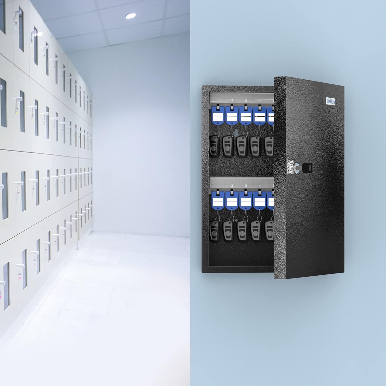 - 【HIGH-QUALITY KEY BOX】 Securely protect your keys from lost with Quality Key Locker & 2 Keys. The spacious 32 position key safe lock box allows you to hang individual keys or multiple keys with the included key tags, making it well organized and easy to get.