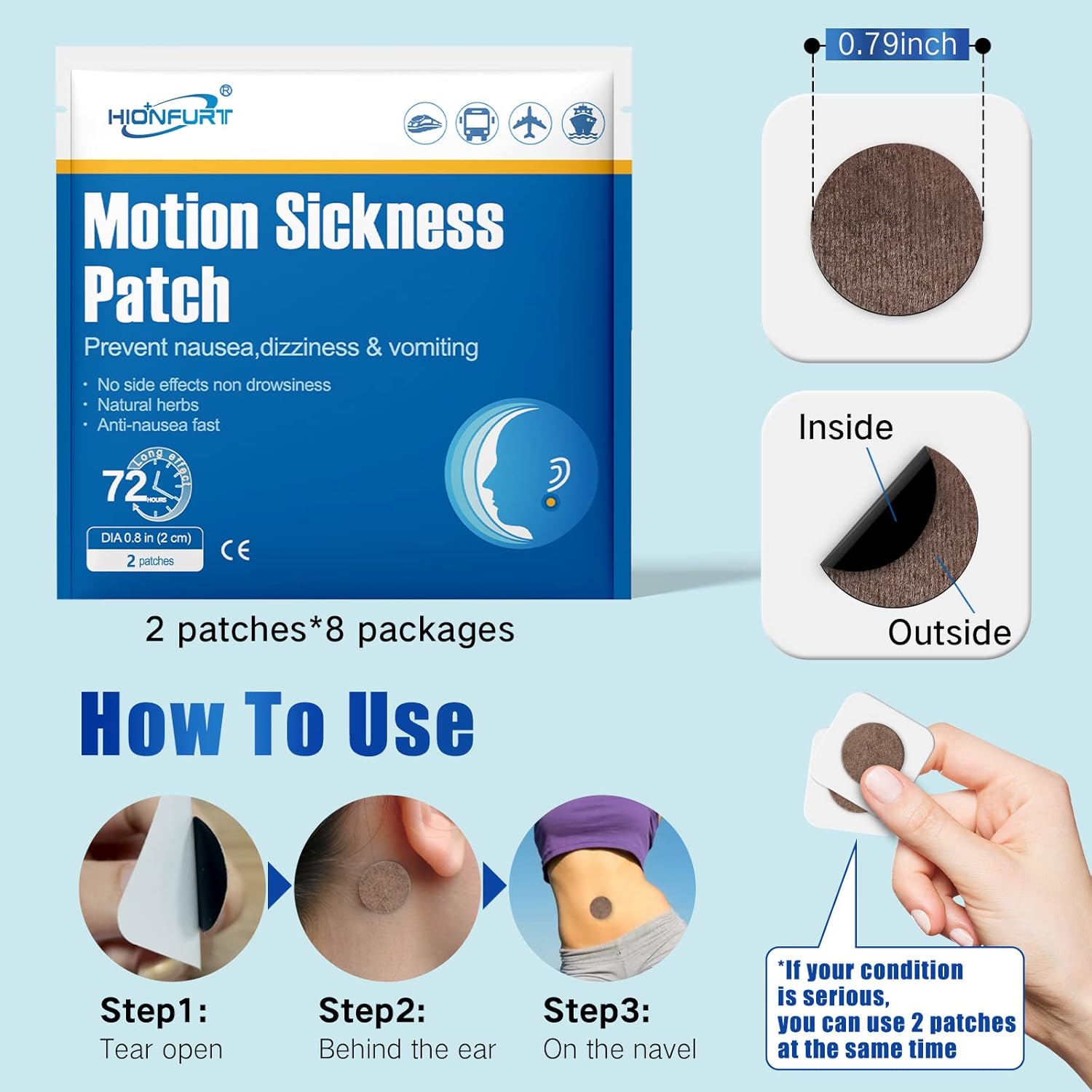 - 【Warm Tips】Motion sickness patches for behind the ear are not suitable for children under the age of 4, pregnant women, lactating women, people with wounds on the ears and navels. Please ensure the skin is clean and dry before applying the patch