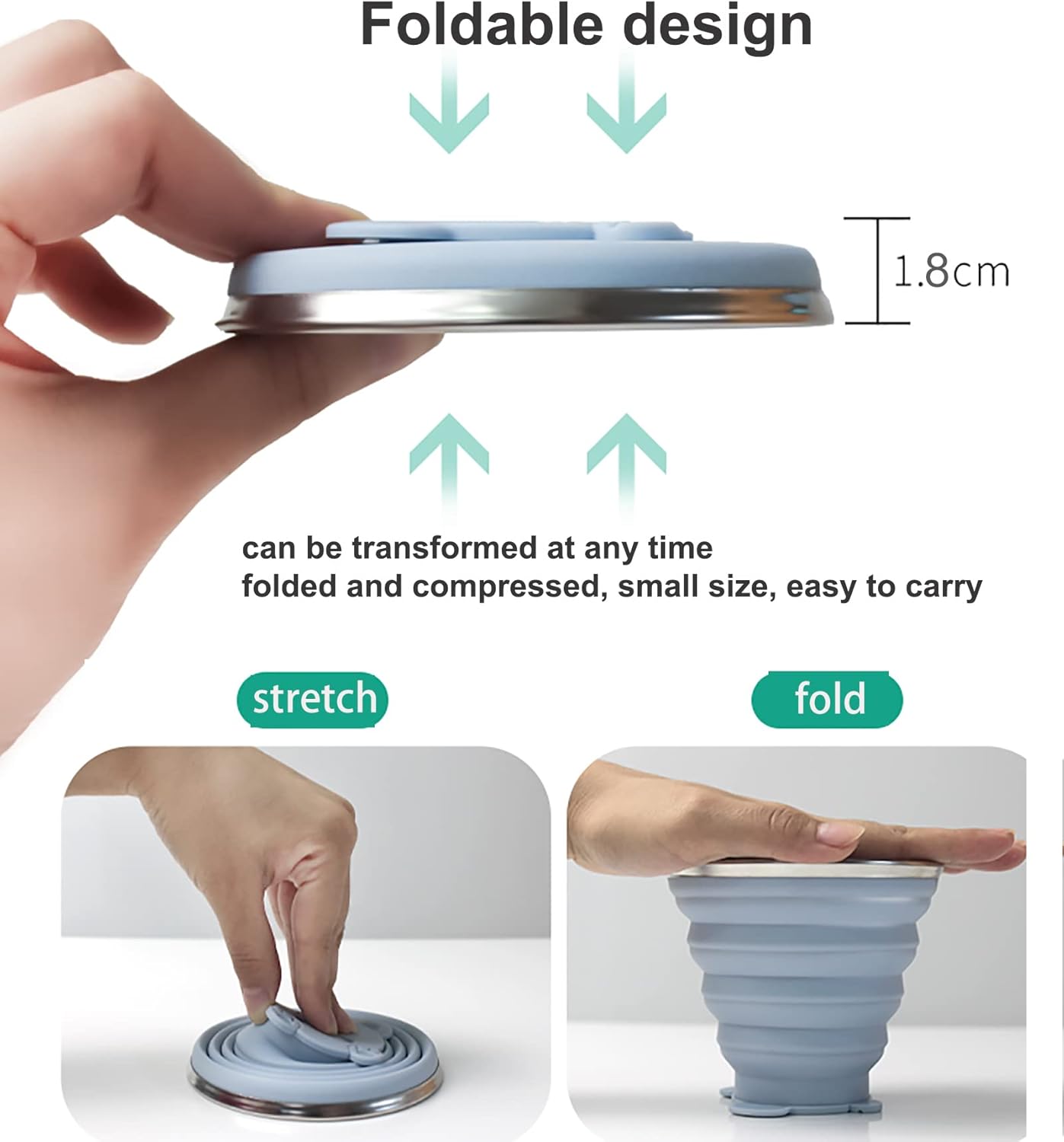 - Size Information: The travel cups capacity 10.8oz(320ml).Before folding,Top diameter 3.74In,Bottom diameter 1.97In,Height 3.35In.After folding, Top diameter 3.74In,Height 0.71In.The small collapsible volume made them both of these use for home and outdoor.
