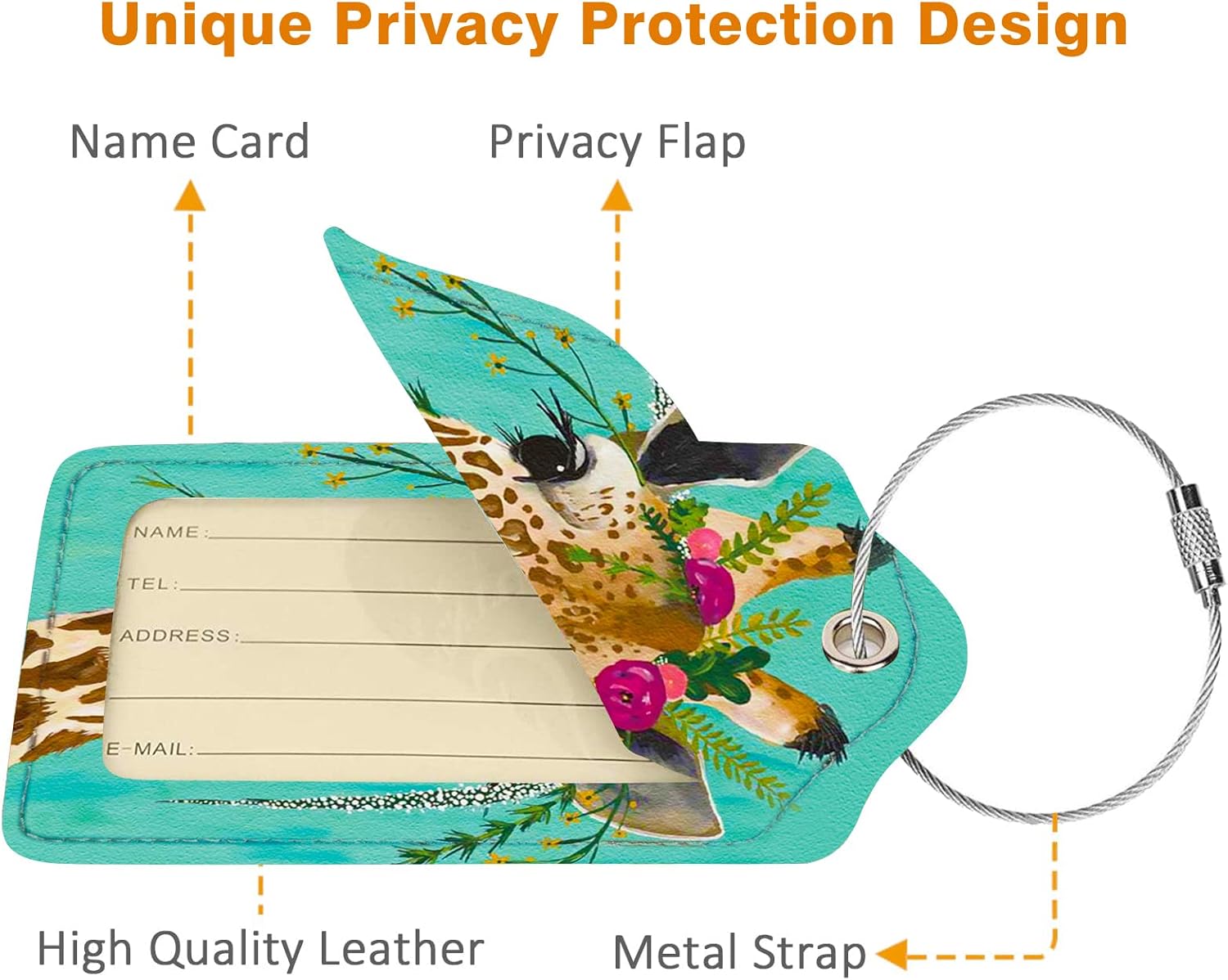 2 Pack Luggage Tag for Suitcase, Cute Unique Leather Bag Tags Identifiers Privacy Cover ID Label with Durable Steel Loop for Women Men Kids Girls Travel, Giraffe