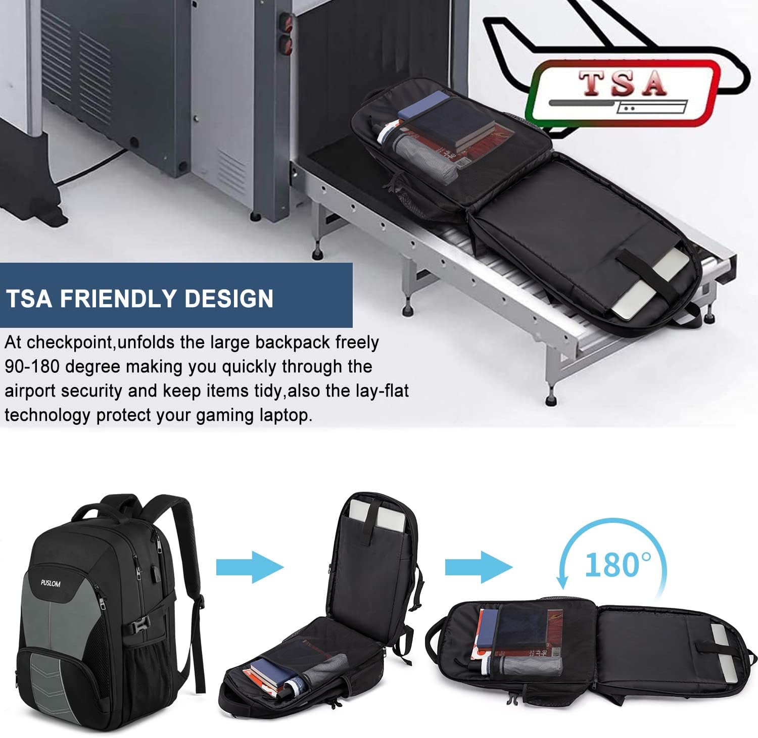 - TSA APPROVED & LUGGAGE SLEEVE - At Checkpoint,Unfolds the smart laptop backpack freely 90-180 degree making you quickly through the airport security and keep items tidy,exclusive designed for flight travel.This tech backpack fits under seat on an airplane.A luggage strap on the back allows the travelling backpack to be fitted on luggage/suitcase,slide over the luggage upright handle tube for easier carrying.Serve as a extra large durable backpack for travel.