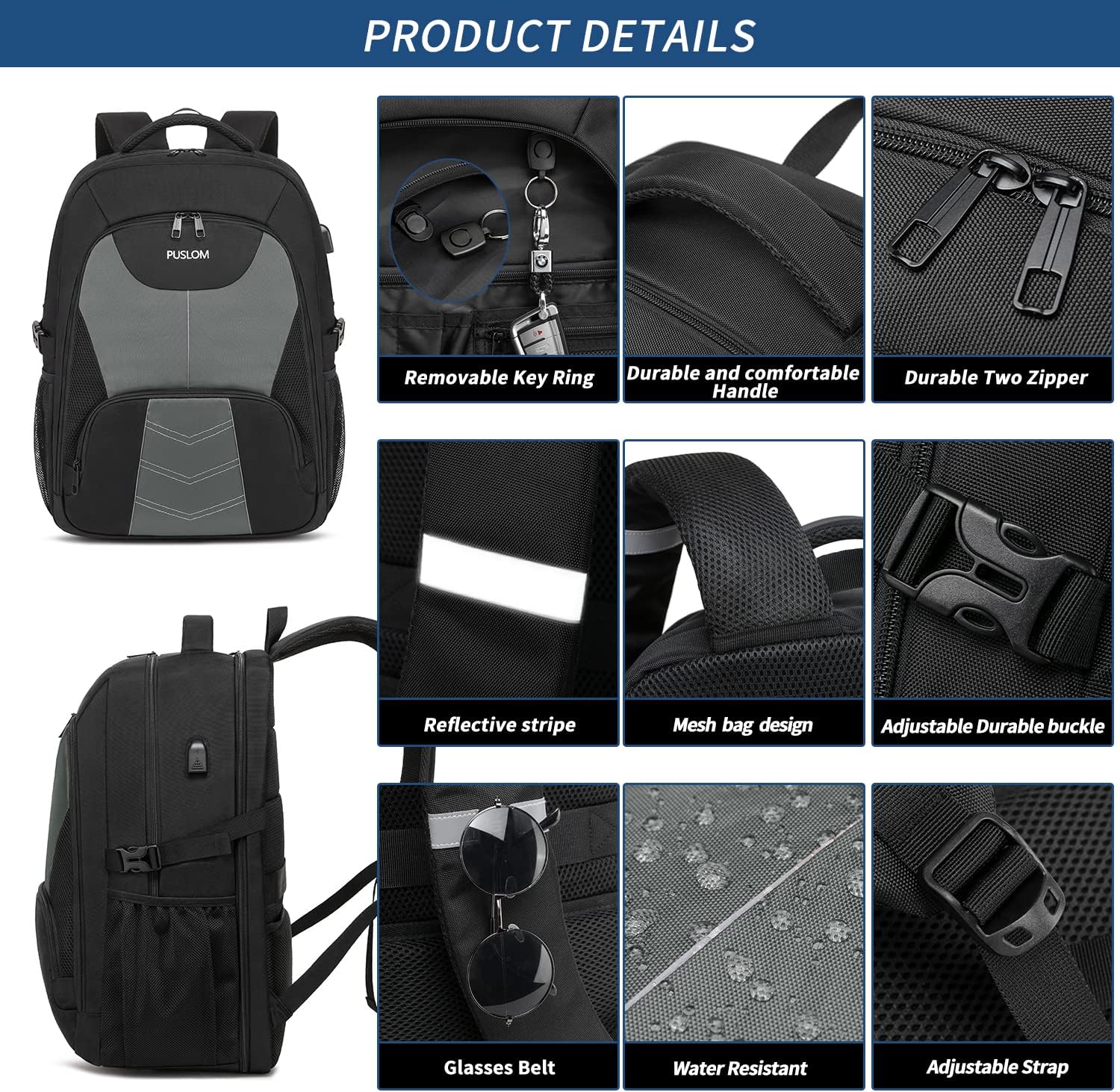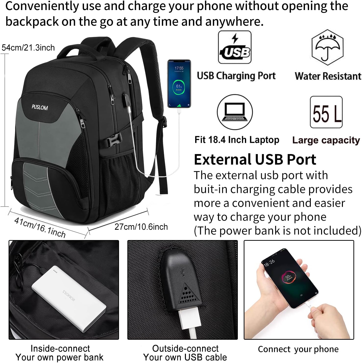 PUSLOM Extra Large Travel Laptop Backpack for Men 55L,Water Resistant 18.4 inch Big Business Laptop bags with USB Charging Port,TSA Friendly Anti Theft Computer Bag for Work College,Grey