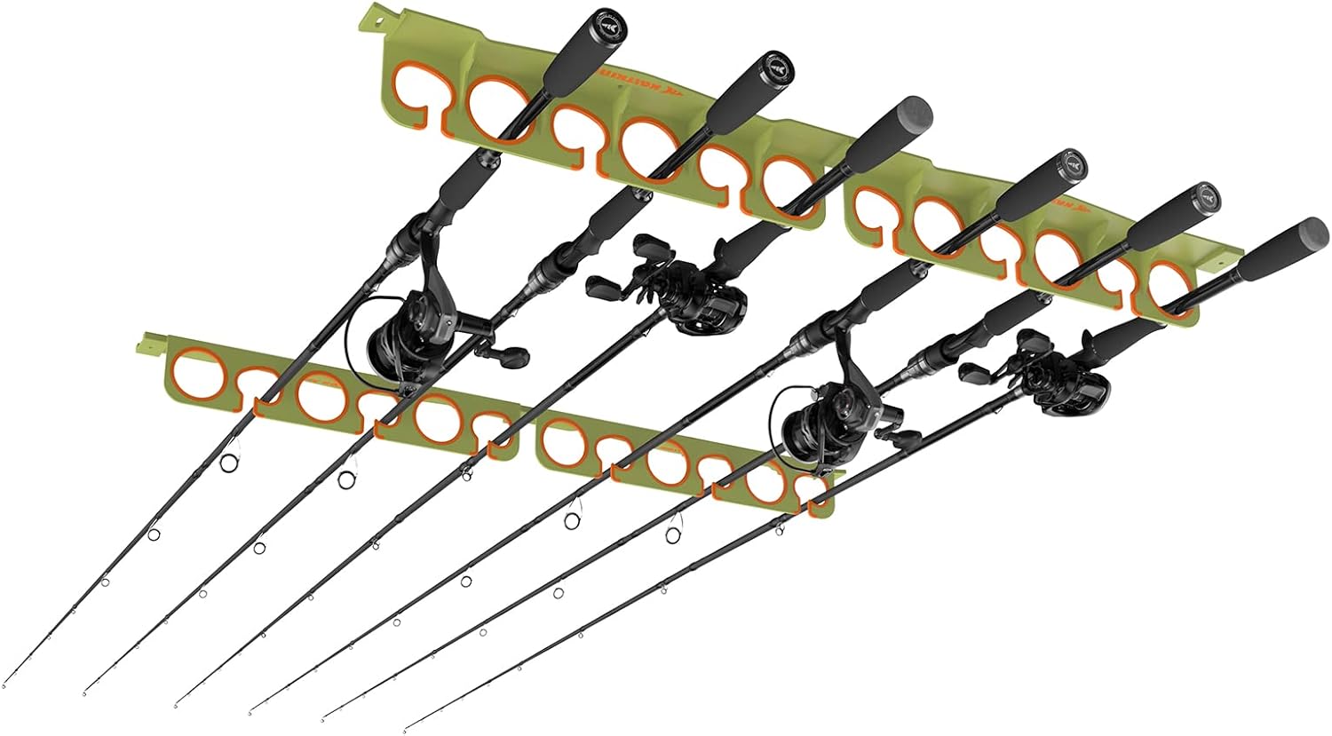 - KEY FEATURES - Store up to 12 fishing rods or fishing rod and reel combos – Features soft polymer lined openings for the handle and top sections to prevent damage to your fishing rods. Easily store rods of any length or diameter out of the way and safe. Easy installation with the included hardware.