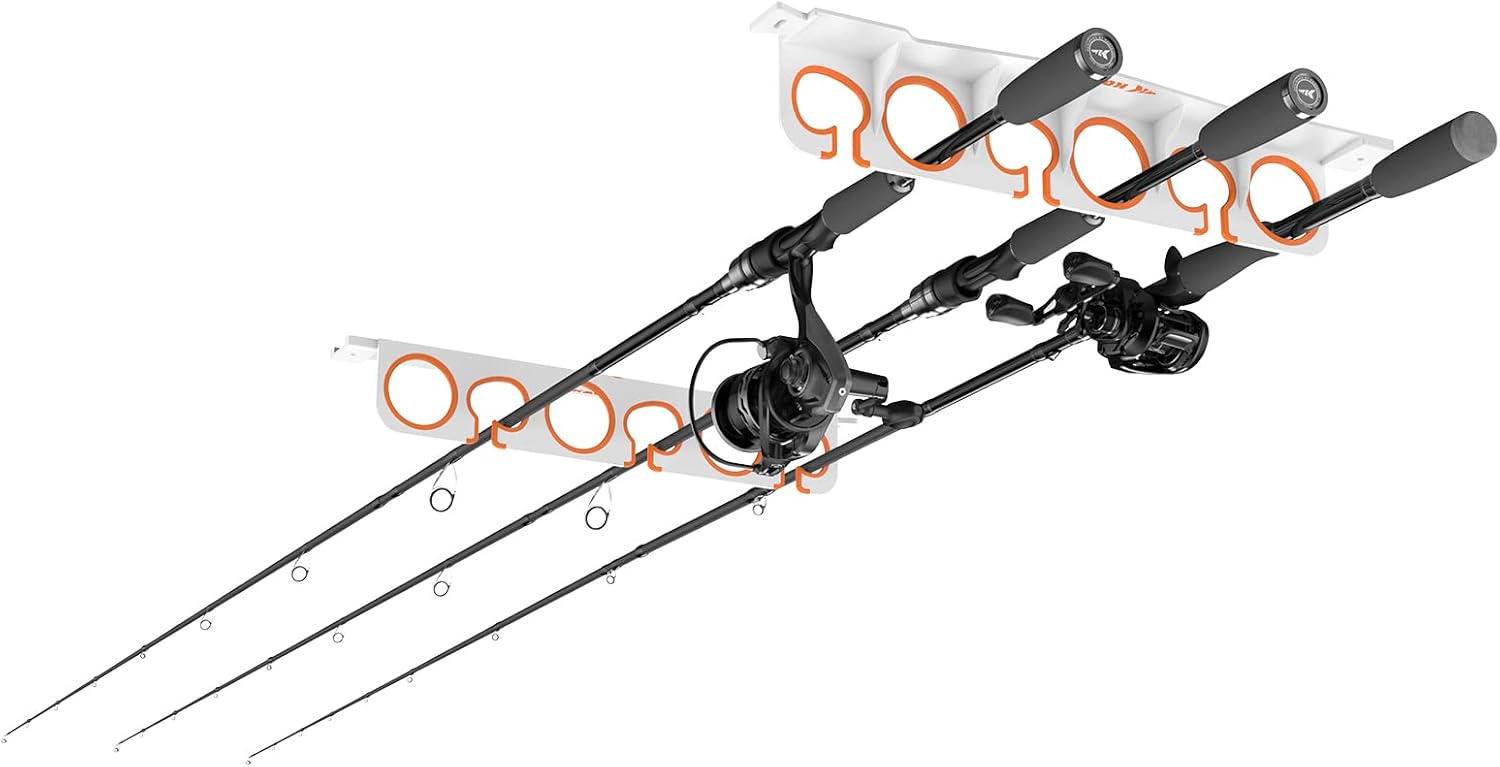 - KEY FEATURES - Store up to 6 fishing rods or fishing rod and reel combos – Features soft polymer lined openings for the handle and top sections to prevent damage to your fishing rods. Easily store rods of any length or diameter out of the way and safe. Easy installation with the included hardware.