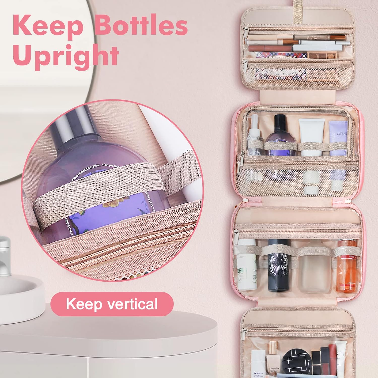 - Neat and Organized: There are 4 separate compartments inside the travel makeup bag to keep all your items organized, 2 large main rooms with elastic straps of various sizes, that can accommodate bottles of various shapes and keep the items standing upright. 1 transparent PVC large bag is convenient for storing your mask and cosmetics, plus 1 PVC transparent bag and a mesh bag compartment for conveniently storing your makeup tools, and realize the separation of dry and wet, neat and orderly.