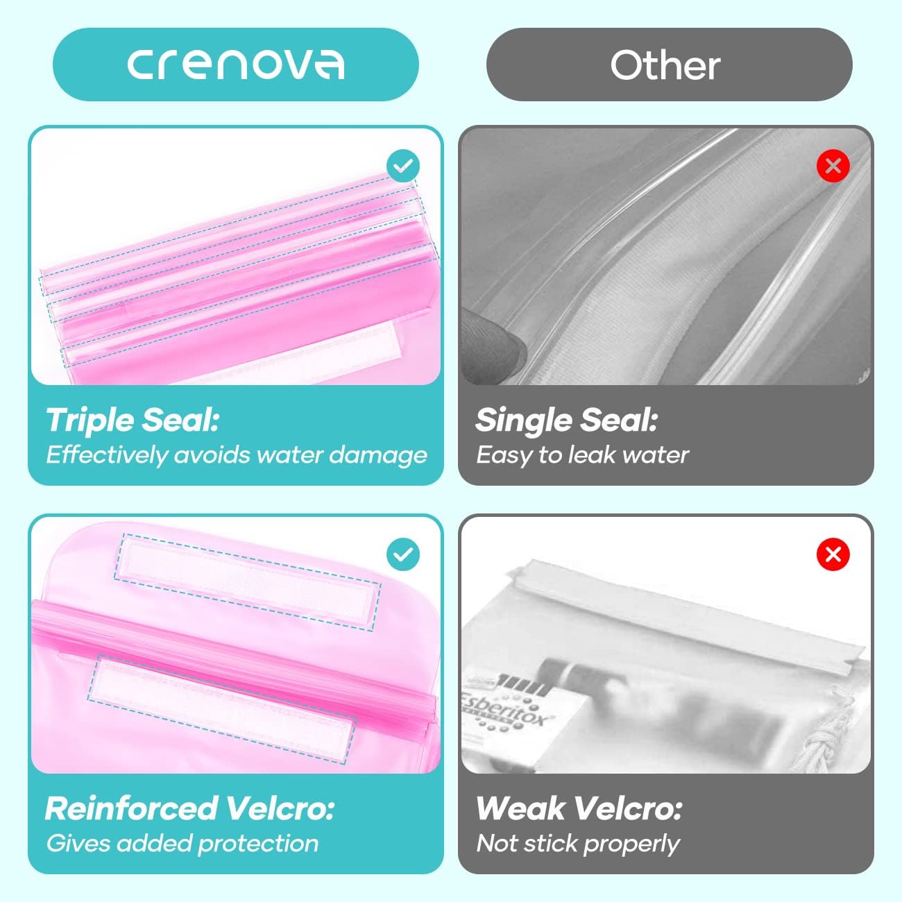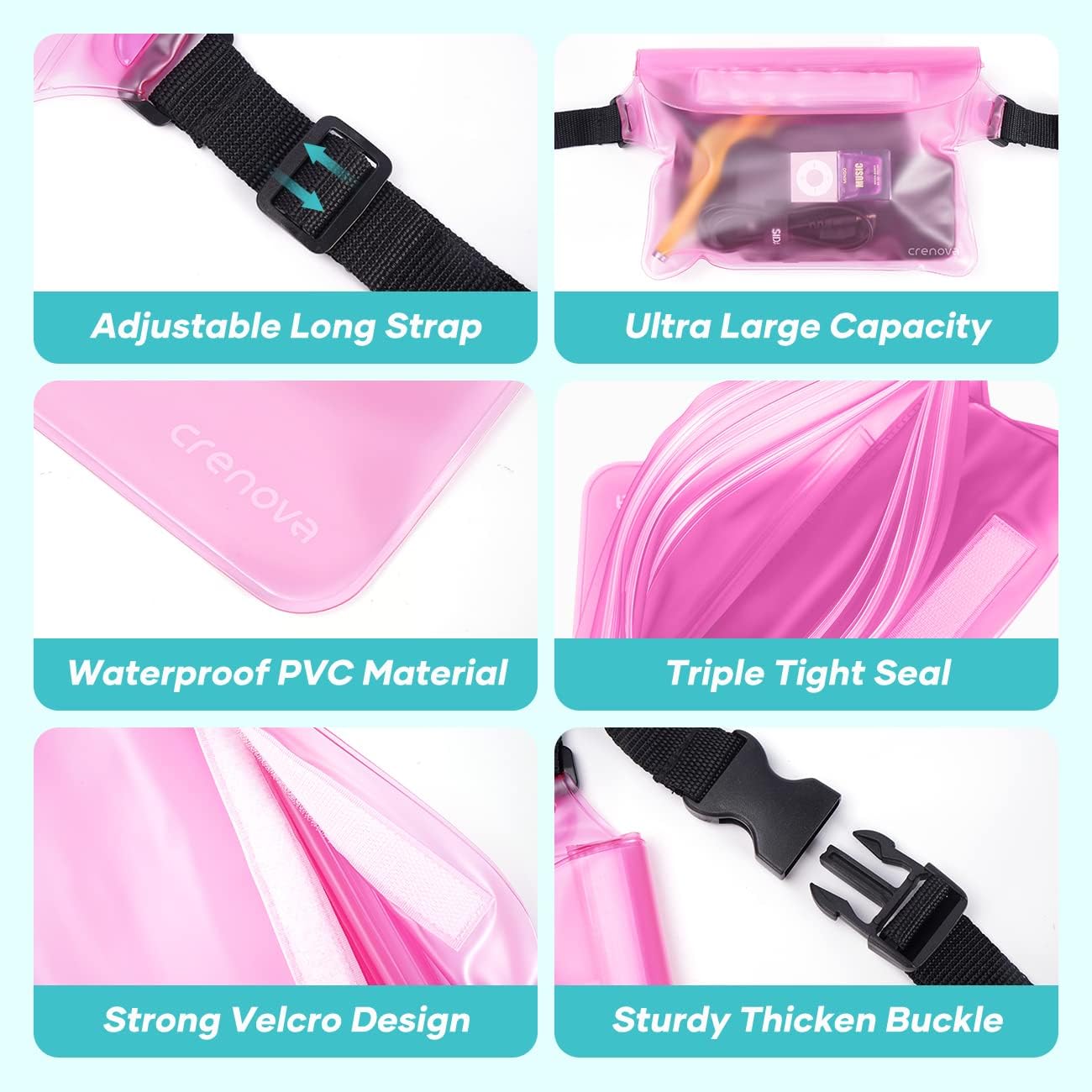 - ⛱️LARGE SPACE- Crenova waterproof pouches measure 8.66Inch x 5.91 Inch. The waterproof pouch has enough space to hold your wallets, phone, passport, keys and other personal items.