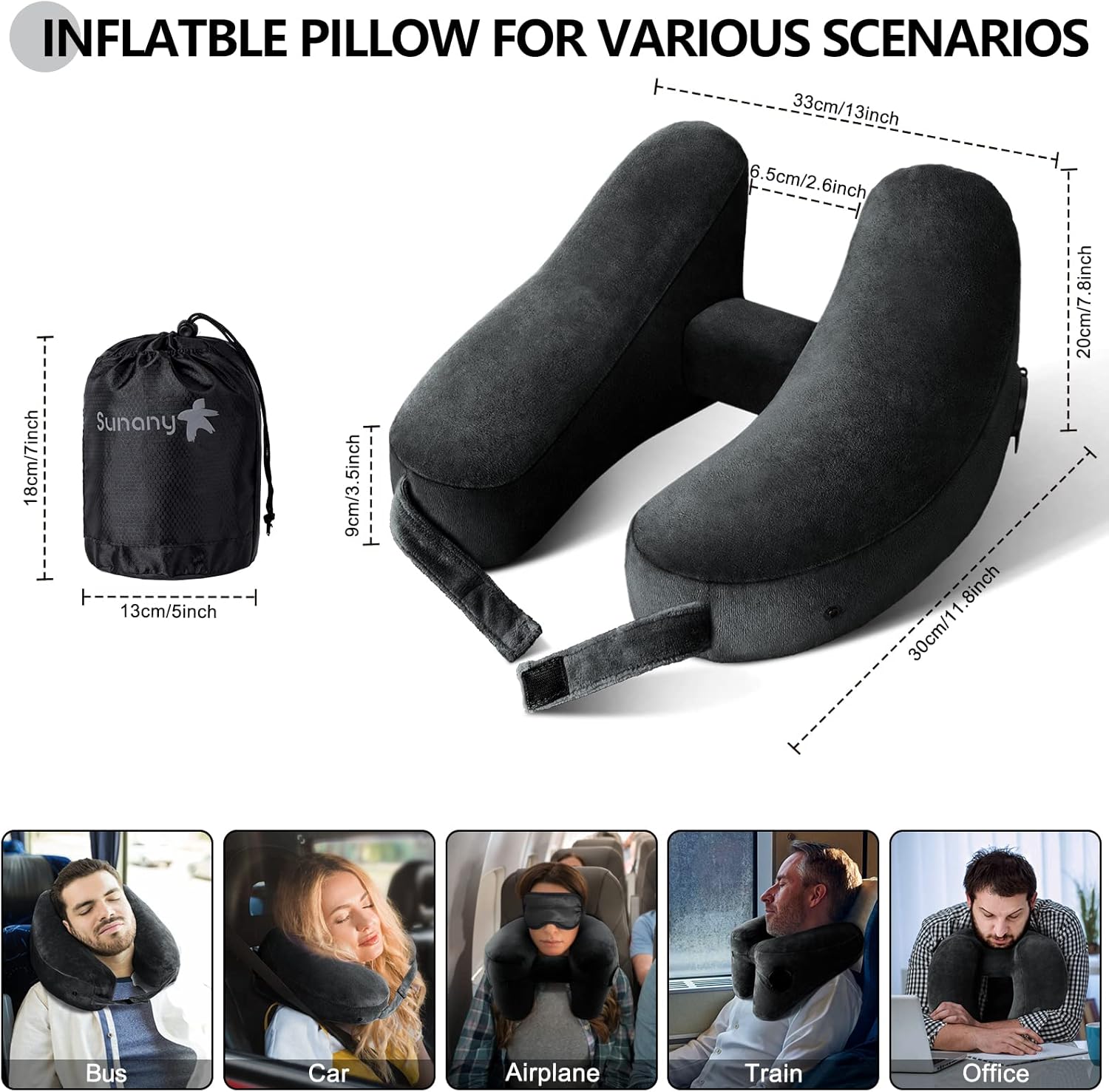 Sunany Neck Pillow for Travel Inflatable Airplane Pillow Comfortably Supports Head, Neck and Chin, Inflatable Travel Pillow with Soft Velour Cover and Portable Drawstring Bag (Black)