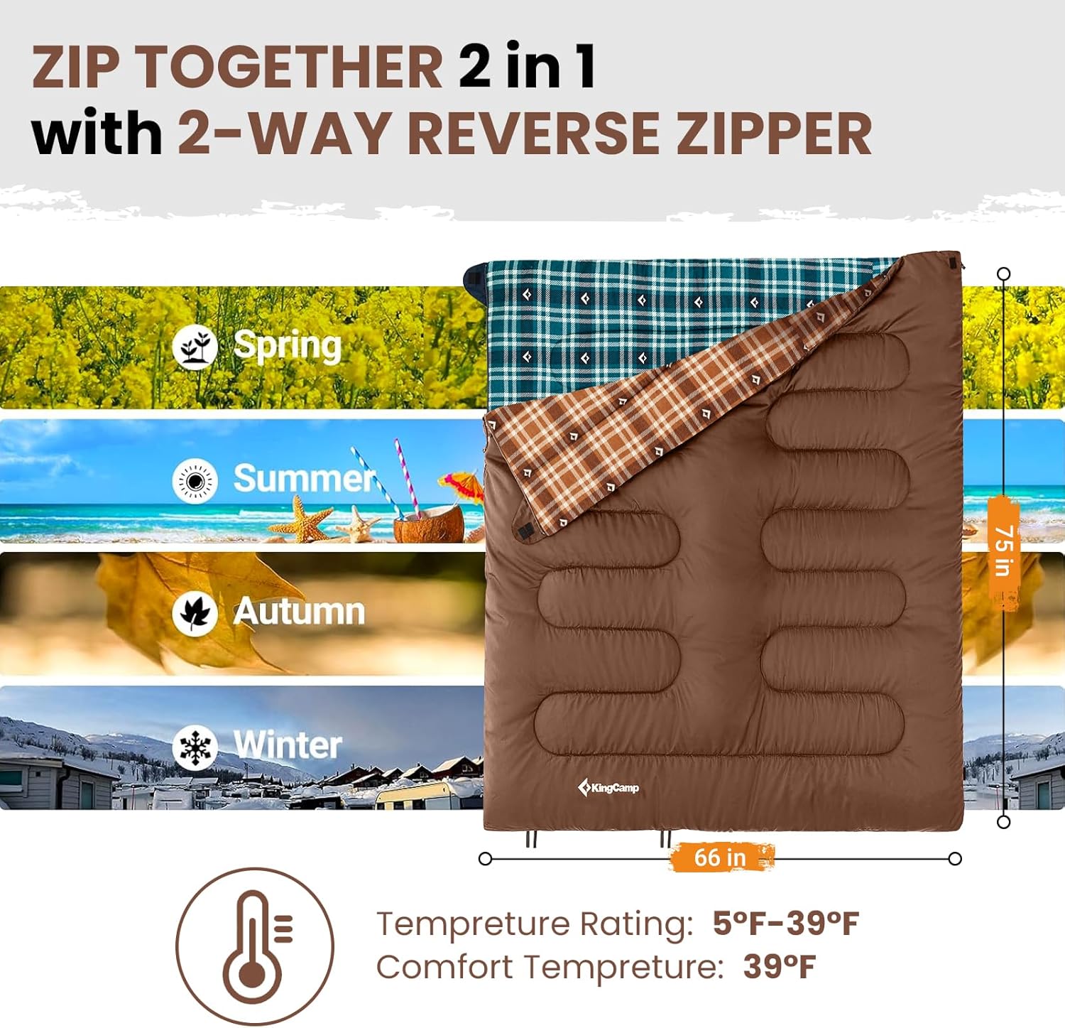 - MULTIFUNCTIONAL DESIGN-More Than Just a Sleeping Bag: This versatile sleeping bag offers more than just a place to sleep! The 2-way zippers allow you to zip two sleeping bags together for couples or family camping. Unzip the bottom for extra ventilation to cool your feet on warmer nights. Not only can it be used as a sleeping bag, but it can also be transformed into a blanket or picnic mat for family trips. Plus, it's machine washable, making cleaning a breeze for frequent use.