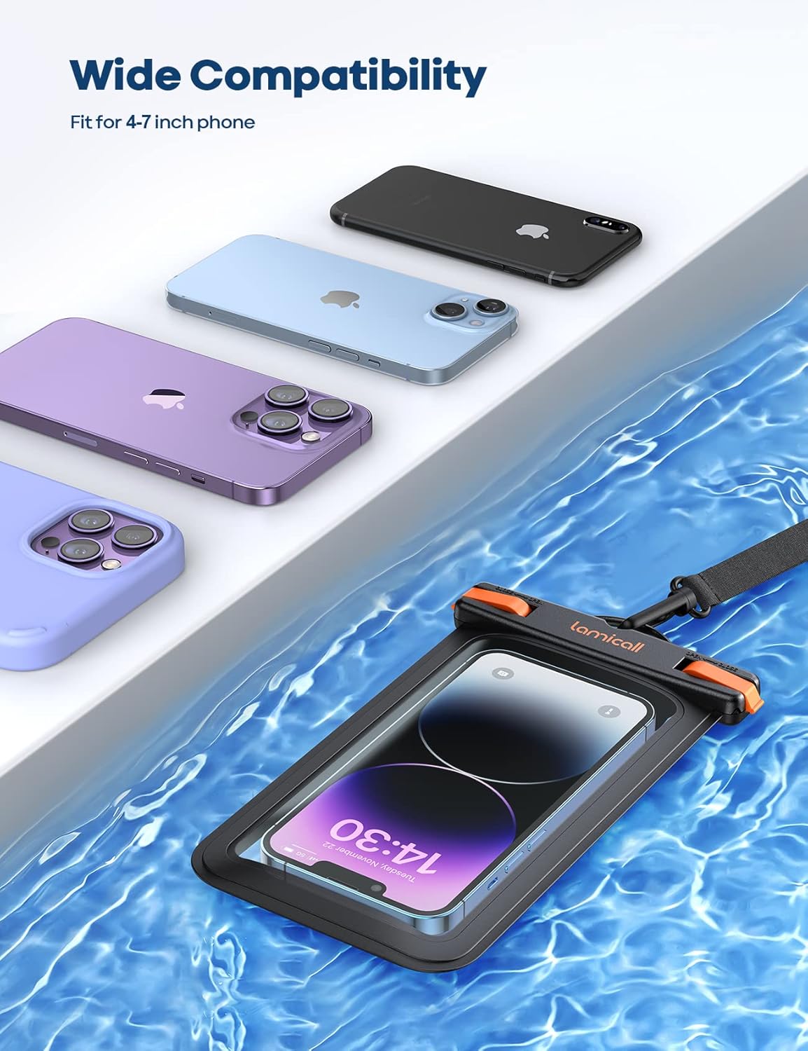 - IPX8 Rating Waterproof: Upgraded locking clips, high quality materials and latest seamless heat-press technology allow Lamicall waterproof phone case an excellent waterproof (IPX8 Rating). It is waterproof to a depth of 100 feet, which protects your smart phone from water, snow, sand, dust, etc.