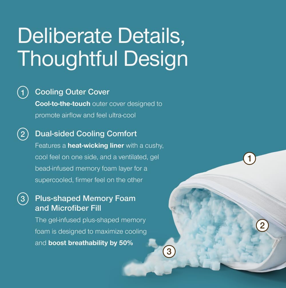 - Complete Cooling Technology: Inside, you get a gel-infused Oomph fill in plus shape for 50% more airflow. The memory foam & microfiber blend in this foam pillow dissipates excess heat for a peaceful slumber, free from overheating & moisture. On the outside, you get a heat-wicking liner & soft cool-touch cover to keep you calm & chill.