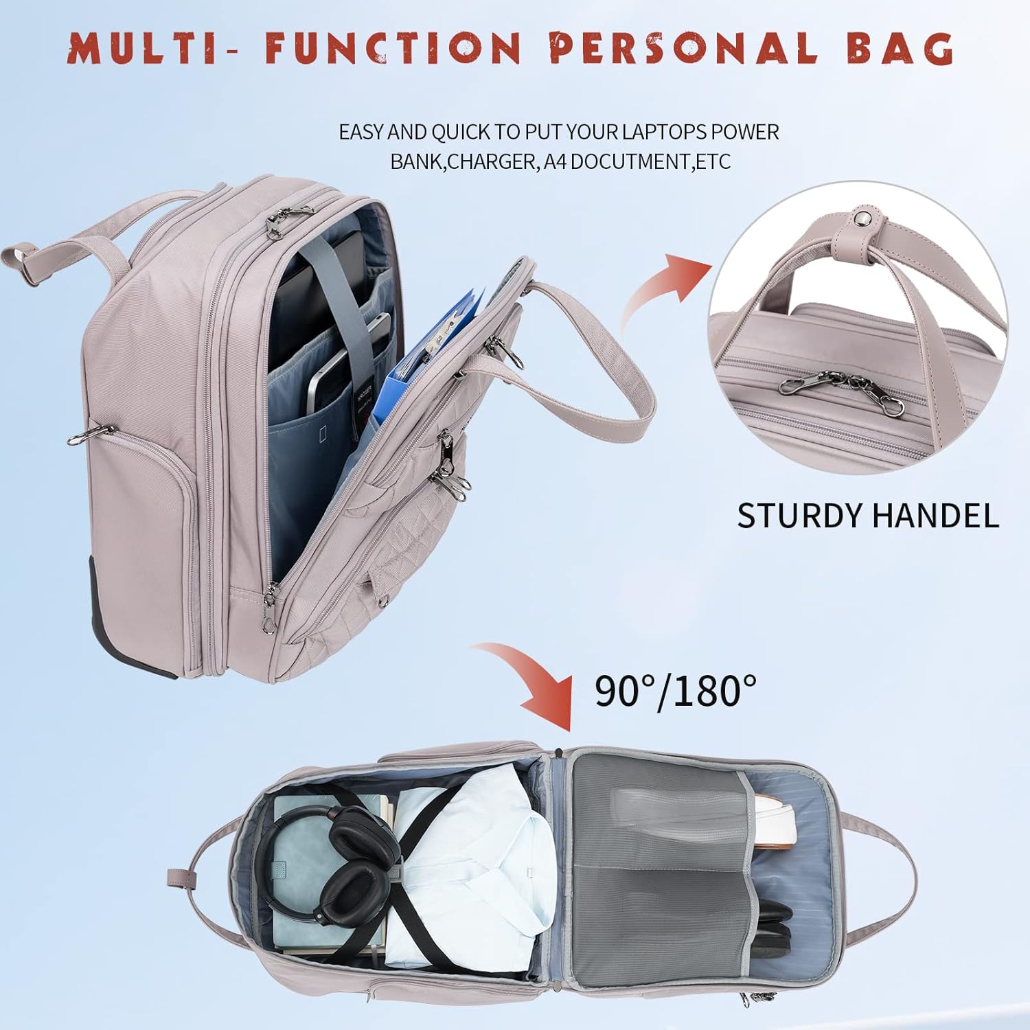 - HASSLE-FREE TRAVEL: Top with sturdy carry handle for easy lifting. Back with a smart Sleeve allows the bag to be placed over the handle of most upright luggage pieces.