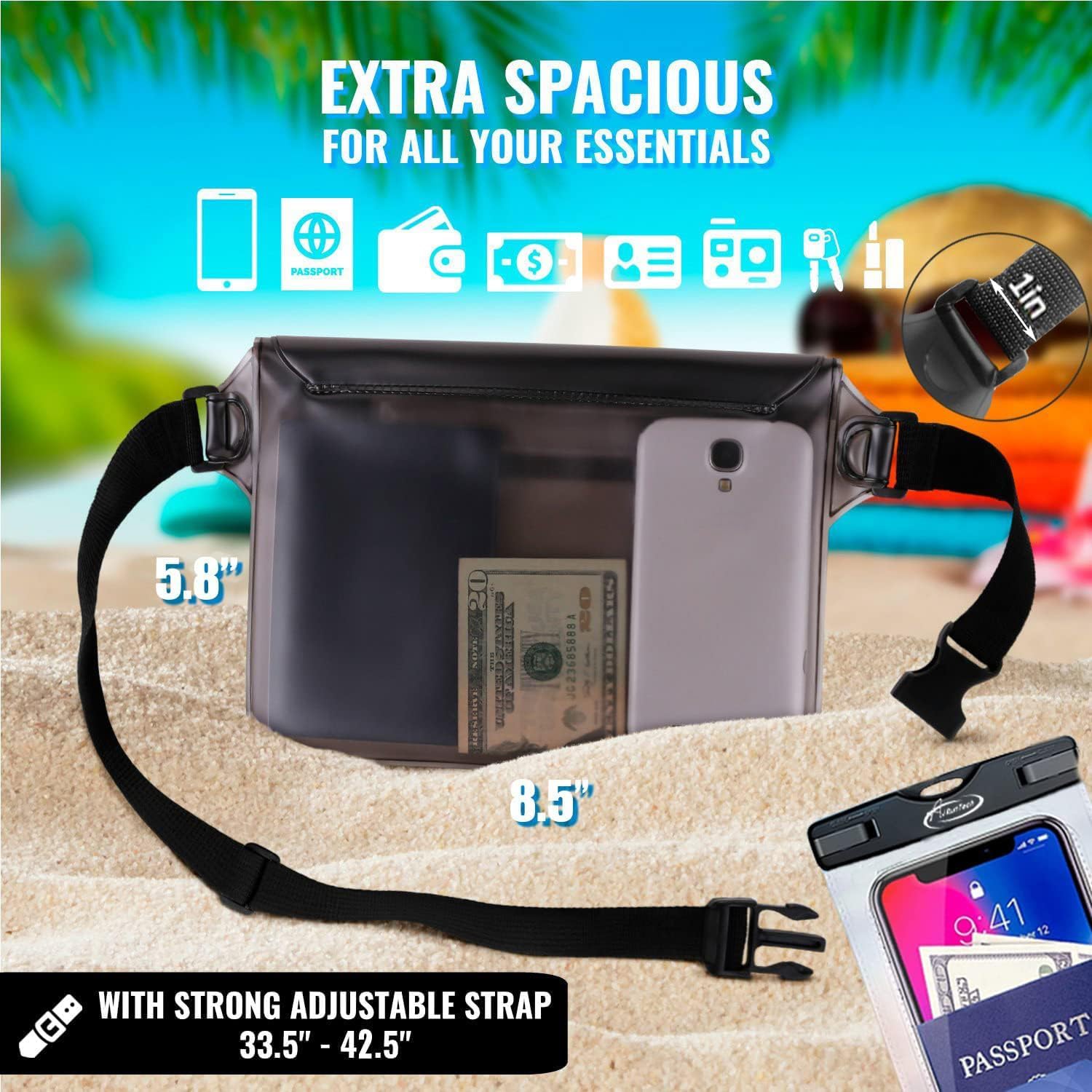- BEACH ESSENTIALS:Certified IPX8 waterproof,effectively protect the safety of mobile phones,wallets,passports,car key and other valuables,rain-proof,snow defence,dustproof and sandproof,make your beach trip more peaceful and enjoyable