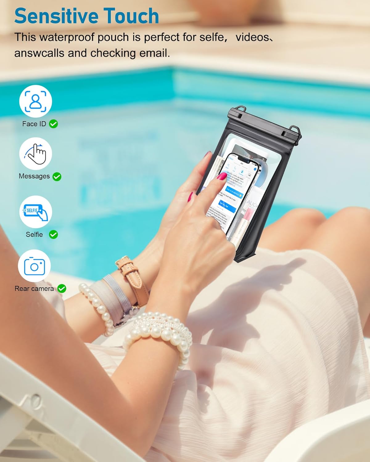 - Sensitive Touch Screen - The waterproof pouch is made of premium soft touch PVC materials, with excellent touch screen performance, allowing you to messages, make a call, watch videos, face recognition, and take selfies without taking out your phone of the pouch and surpport take photo by rear camera(Do not to let other stuff block the phone camera)