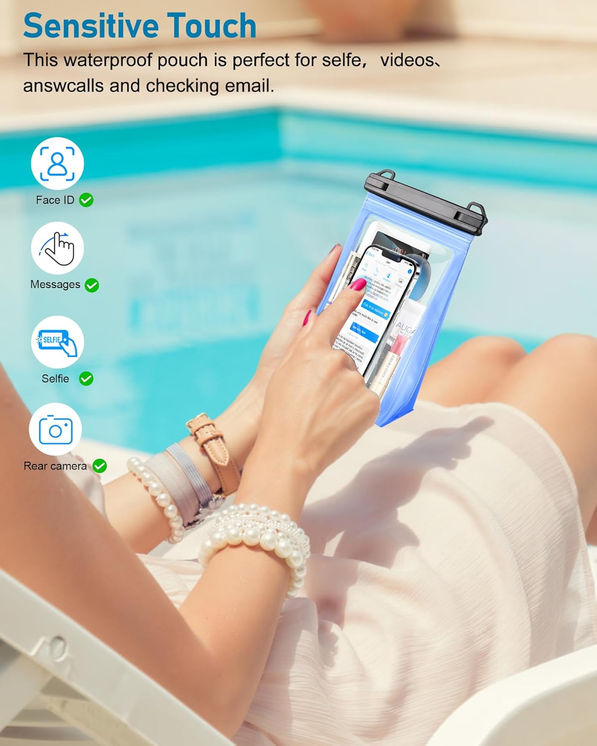 - Sensitive Touch Screen - The waterproof pouch is made of premium soft touch PVC materials, with excellent touch screen performance, allowing you to messages, make a call, watch videos, face recognition, and take selfies without taking out your phone of the pouch and surpport take photo by rear camera(Do not to let other stuff block the phone camera)