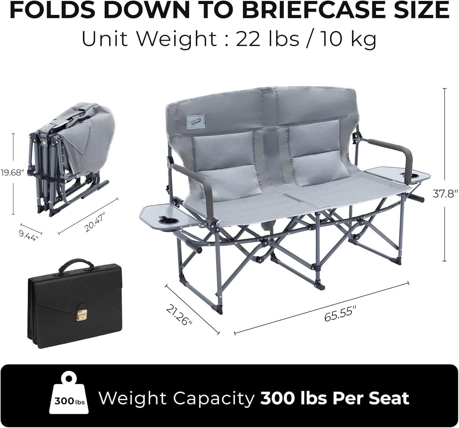 - FOLDS INTO THE SIZE OF A BRIEFCASE – This chair folds more compact than other loveseats, perfect for taking with you whether you are tailgating, camping, or picnicking.