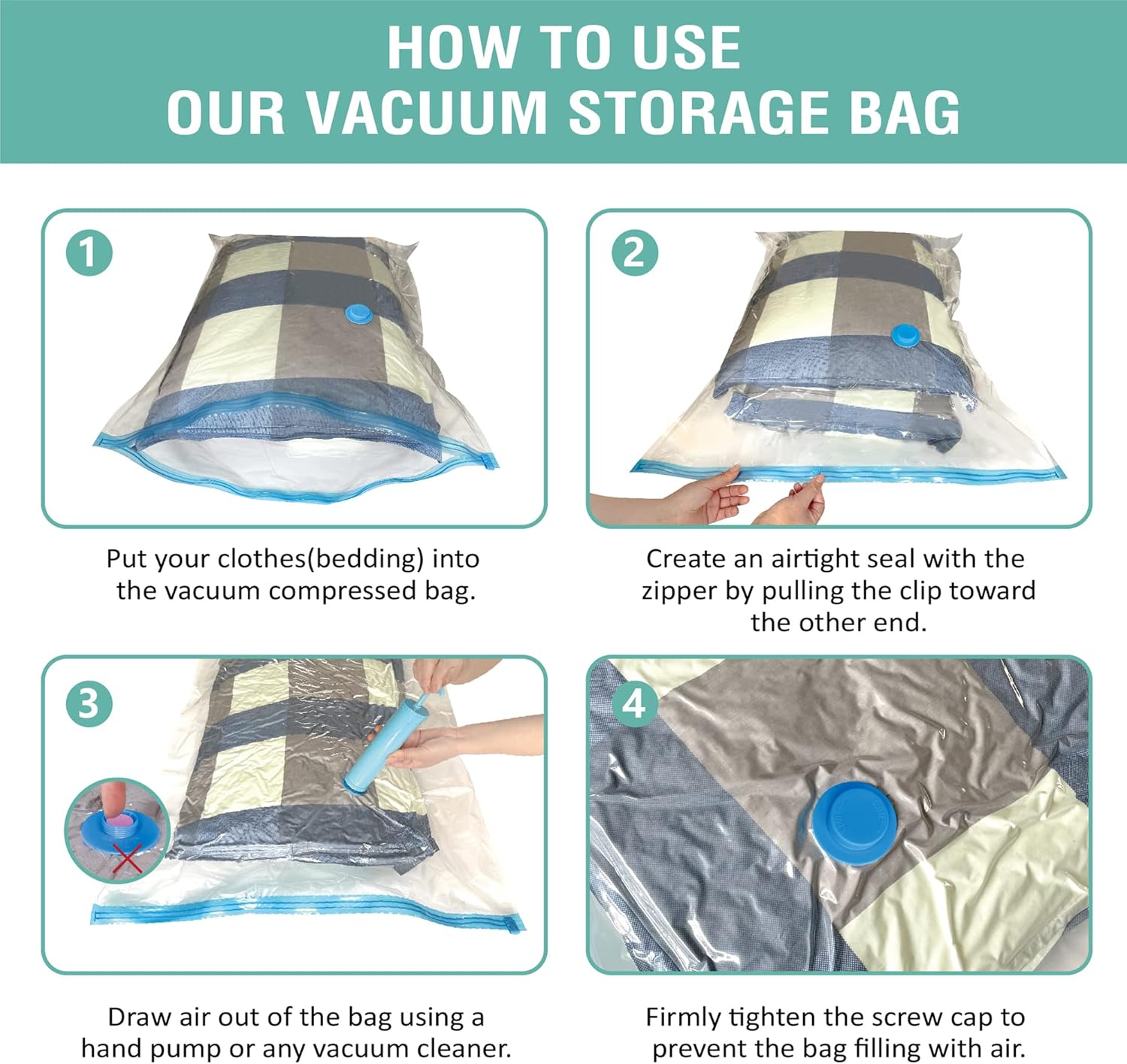 - Hand Pump Included for Easy Use: Works with standard vacuum cleaner. Simply put the items in our storage vacuum bag, seal the zipper, suck out the air, close the lid. You can also use the pump included to easily vacuum storage your items.