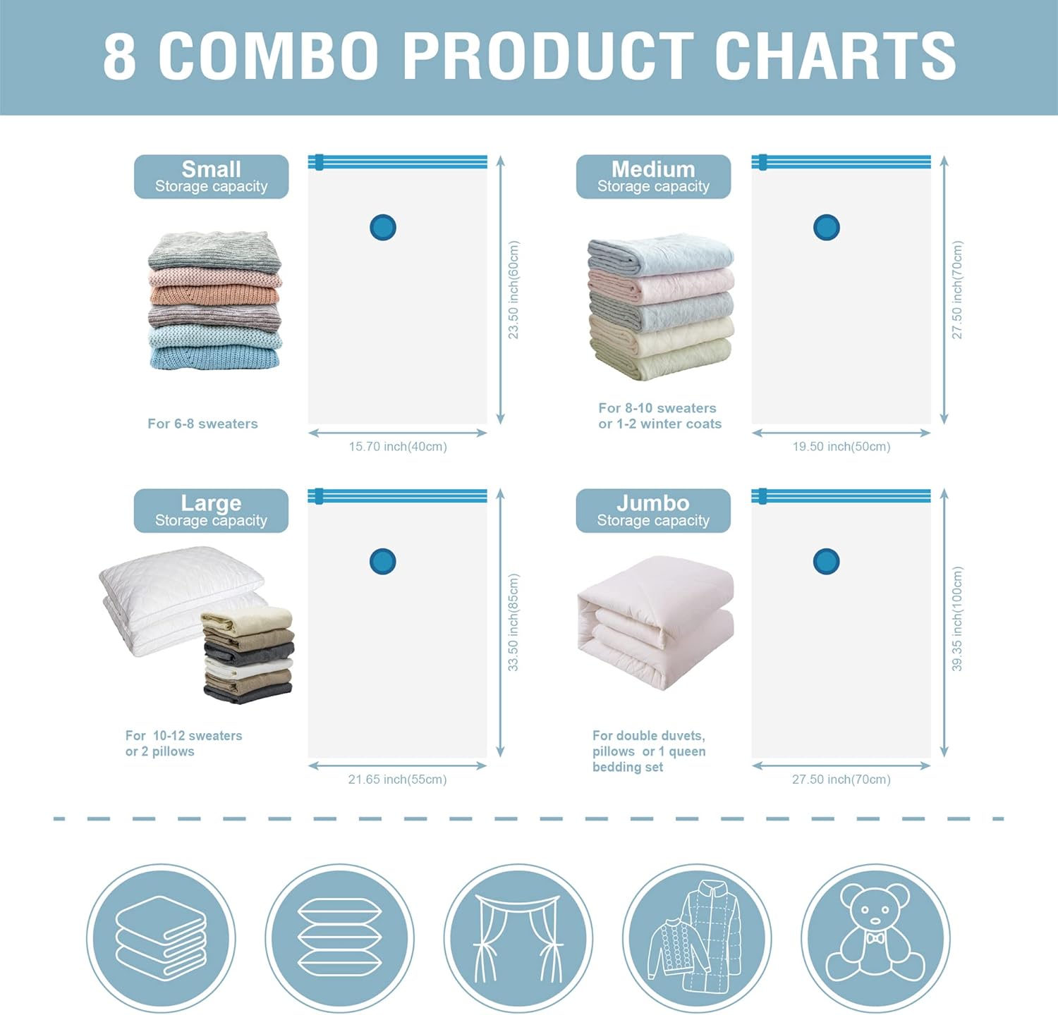 - 8 PACK INCLUDES: 2 Jumbo: 39.35” X 27.5”(100cm X 70cm); 2 Large: 33.5” X 21.65”(85cm X 55cm); 2 Medium: 27.5”X 19.5”(70cm X 50cm); 2 Small: 23.5”X 15.7” (60cm X 40cm).