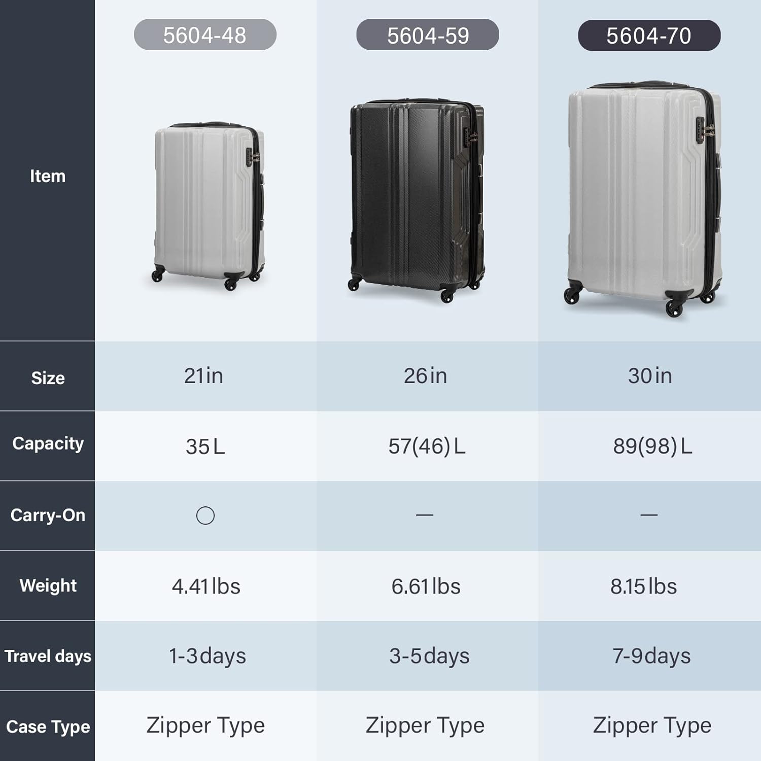 - Zipper type with expanding function (check-in size exception). 3cm extension by opening the zipper. *5604-59 and 5604-70 only