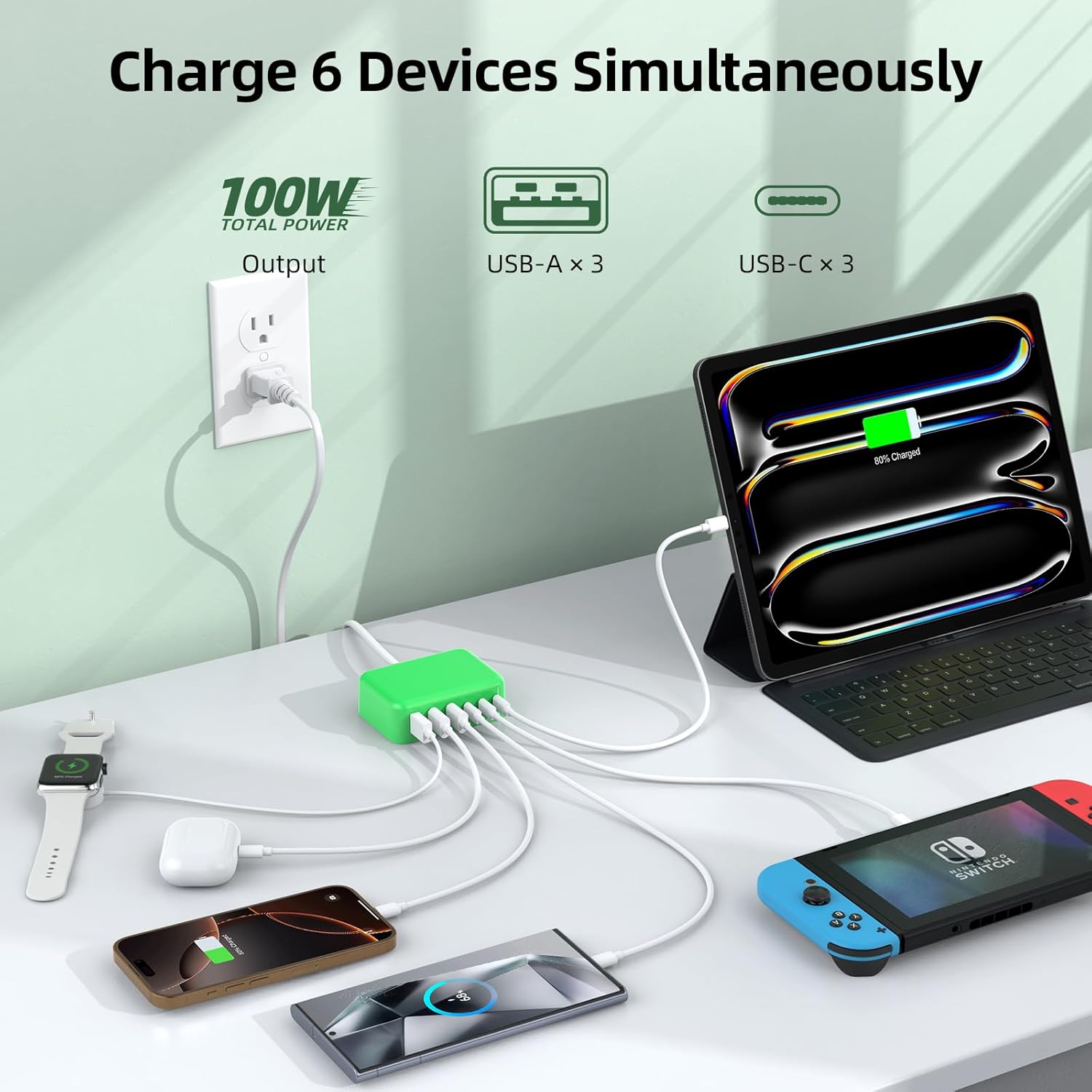 - ⚡【Super Fast Charging】USB C Charger Block with 3 USB-C Power Delivery port(each port 20W max) and 3 QC USB-A port(each port 18W max), total output power up to 100W. Equipped with a 5 ft extension cord, it is not restricted by distance and can be charged without restraint. 6 in 1 USB-C Charging Station can provide high-speed charging for iPhone, Samsung, ipad, watch, fan, portable charger and other 6 devices at the same time. Charge your iPhone 14 from 0% to 50% in just 30 minutes