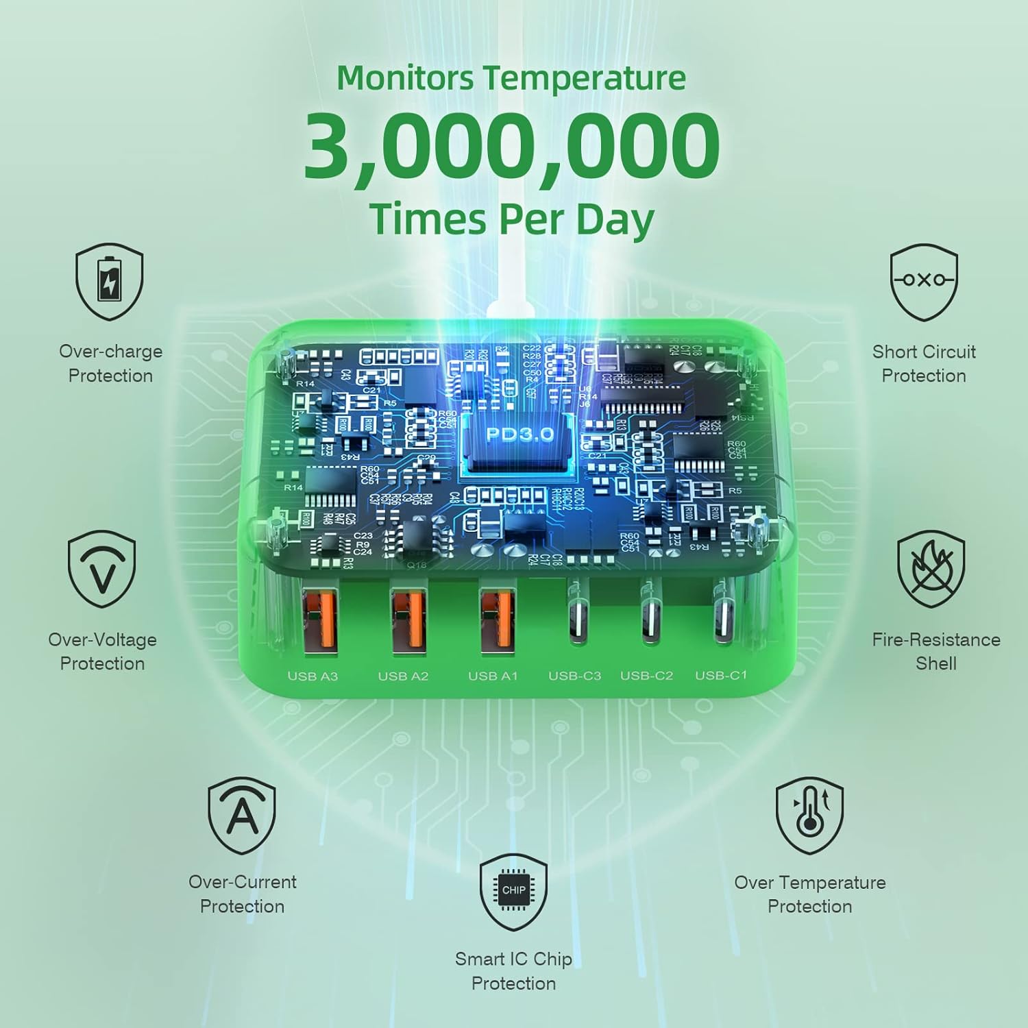 - ⚡【Safety & Reliability】Built with premium Navitas Gallium Nitride (GaN) chipsets operate more efficiently and generate less heat.The multiport USB C desktop charging station boasts over-current, over-voltage, short-circuit, and overheating protection, maximizing the charging safety. USB C wall charger passed UL CE FCC RoHS safety certification ensures 100% complete protection for you and your devices