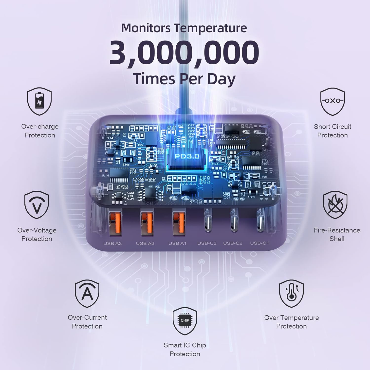 - ⚡【Safety & Reliability】Built with premium Navitas Gallium Nitride (GaN) chipsets operate more efficiently and generate less heat.The multiport USB C desktop charging station boasts over-current, over-voltage, short-circuit, and overheating protection, maximizing the charging safety. USB C wall charger passed UL CE FCC RoHS safety certification ensures 100% complete protection for you and your devices