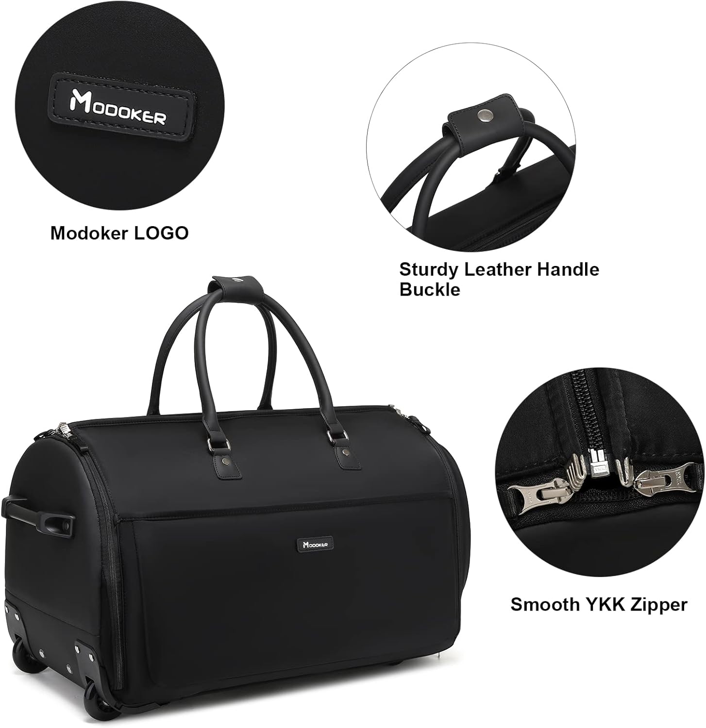 - 3 IN 1 MODOKER ROLLING GARMENT BAG: With the fancy design of combining the feature of Rolling Garment Bag and Duffel Bag, Modoker Garment Duffel Bag is not only a business overnight suit bag, but also a great duffel luggage for weekender travel essentials. This duffle bag with wheels will free your hands, and the sturdy handle with buckle is easy for you to pick up, it is a solid choice for whom heading for a business trips or weekend getaway.