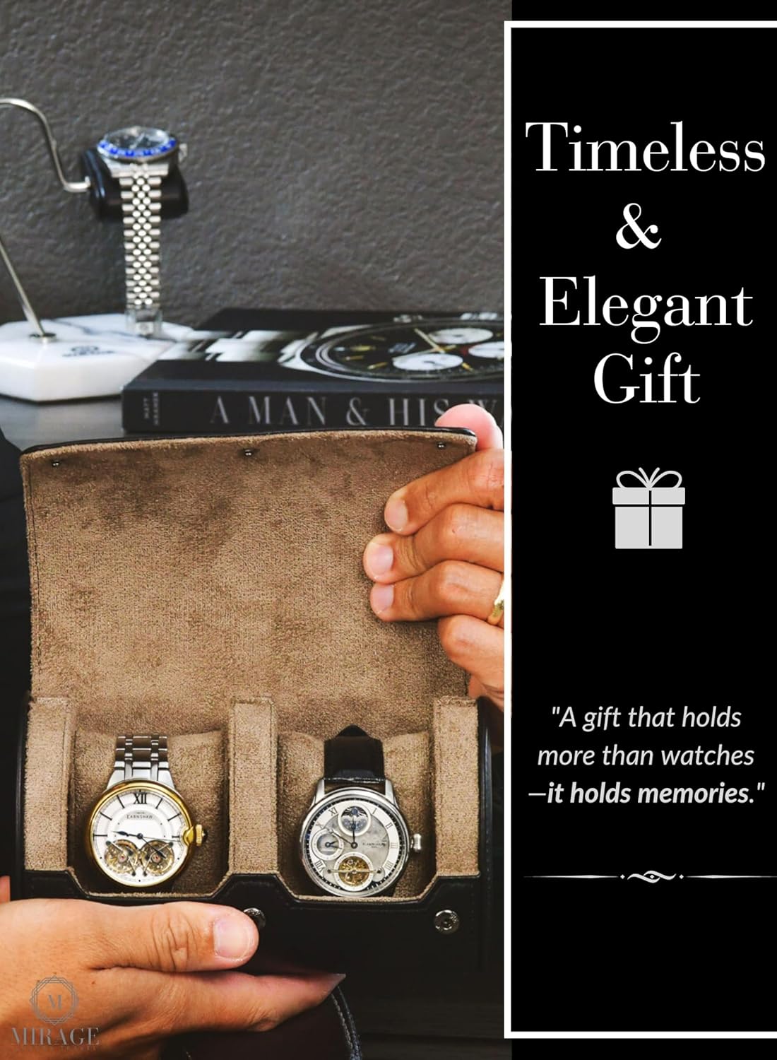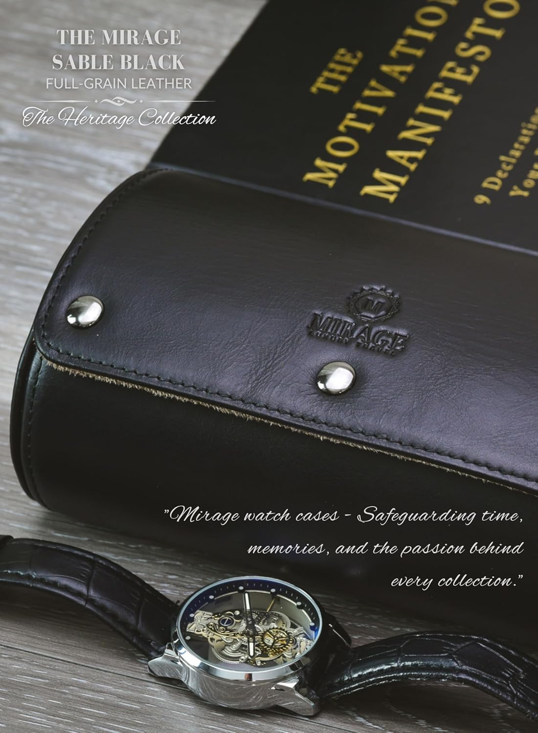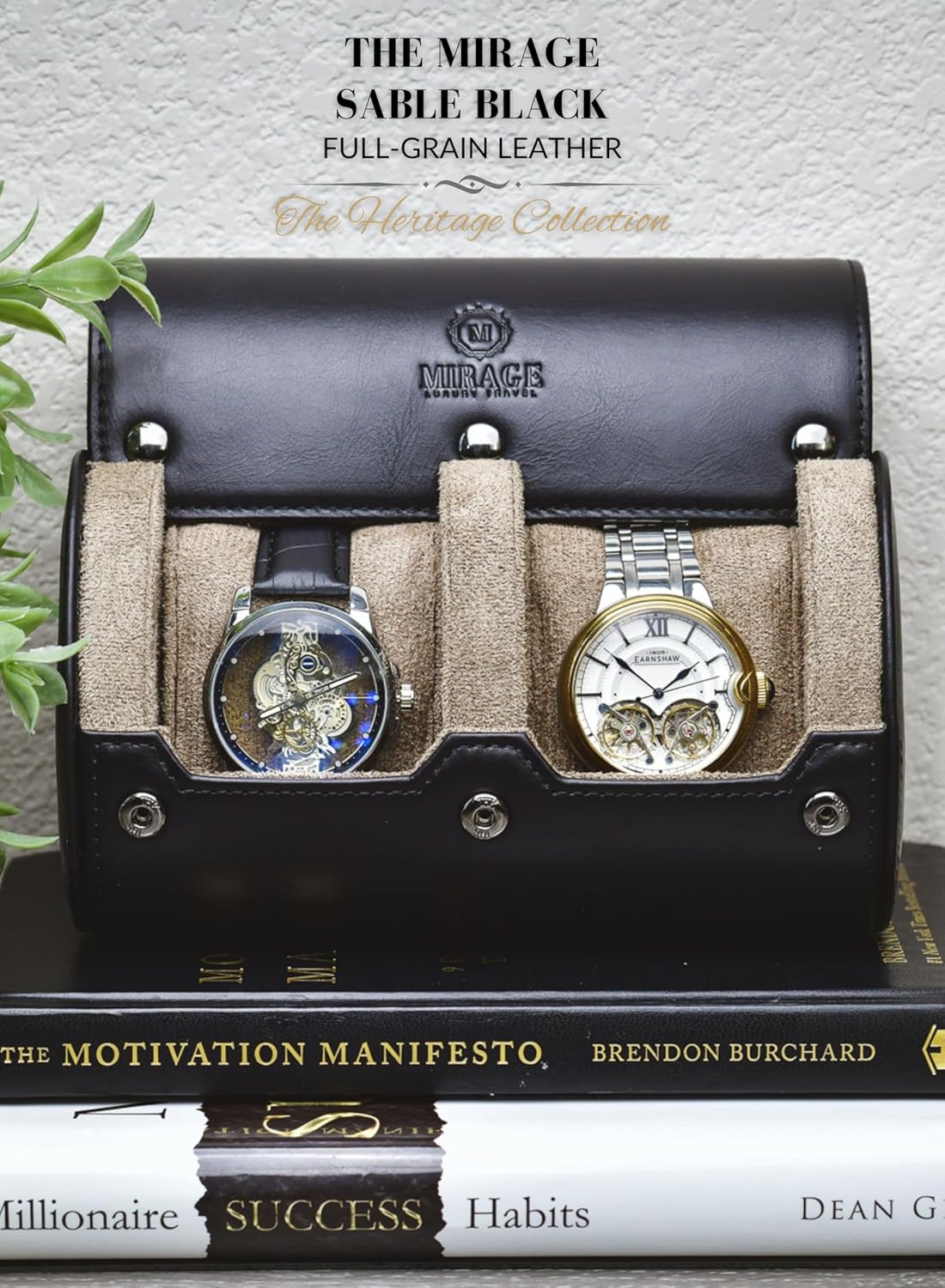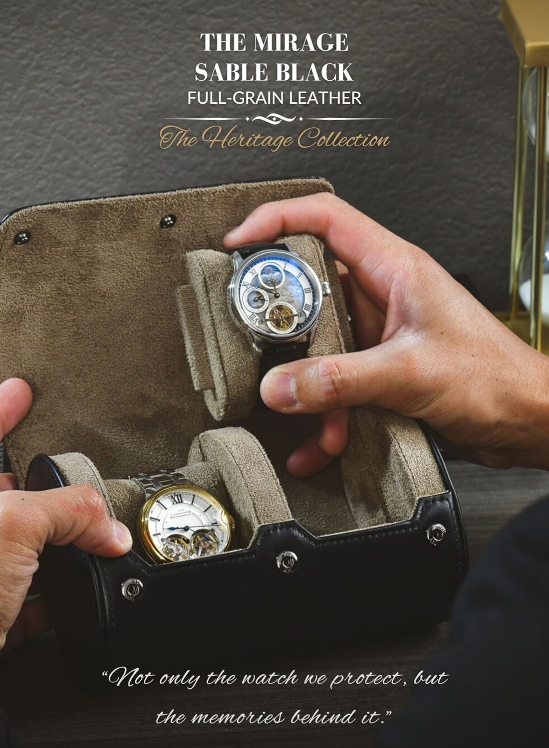 - ⌚ FULL-GRAIN COW LEATHER - Mirage Luxury Travel is the original creator of this unique leather watch case travel design, as our reviews will attest. Our watch roll is handcrafted, and inspired by Swiss design, is made from full-grain leather. Featuring accent stitching for added elegance, button closure for superior protection, and a luxurious soft-touch inner suede lining watch roll.