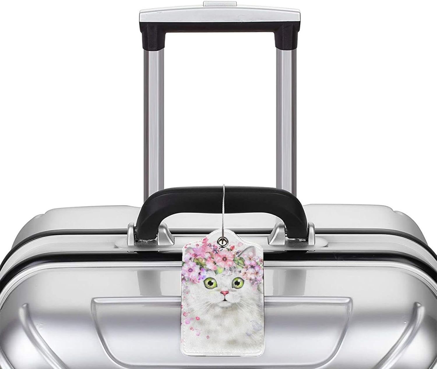 2 Pcs Cute White Cat with Pink Flowers Pattern Leather Luggage Tags, Funny Animal-Themed Suitcase Labels Bag Tag Name ID Labels with Privacy Cover for Teen Kids Adults