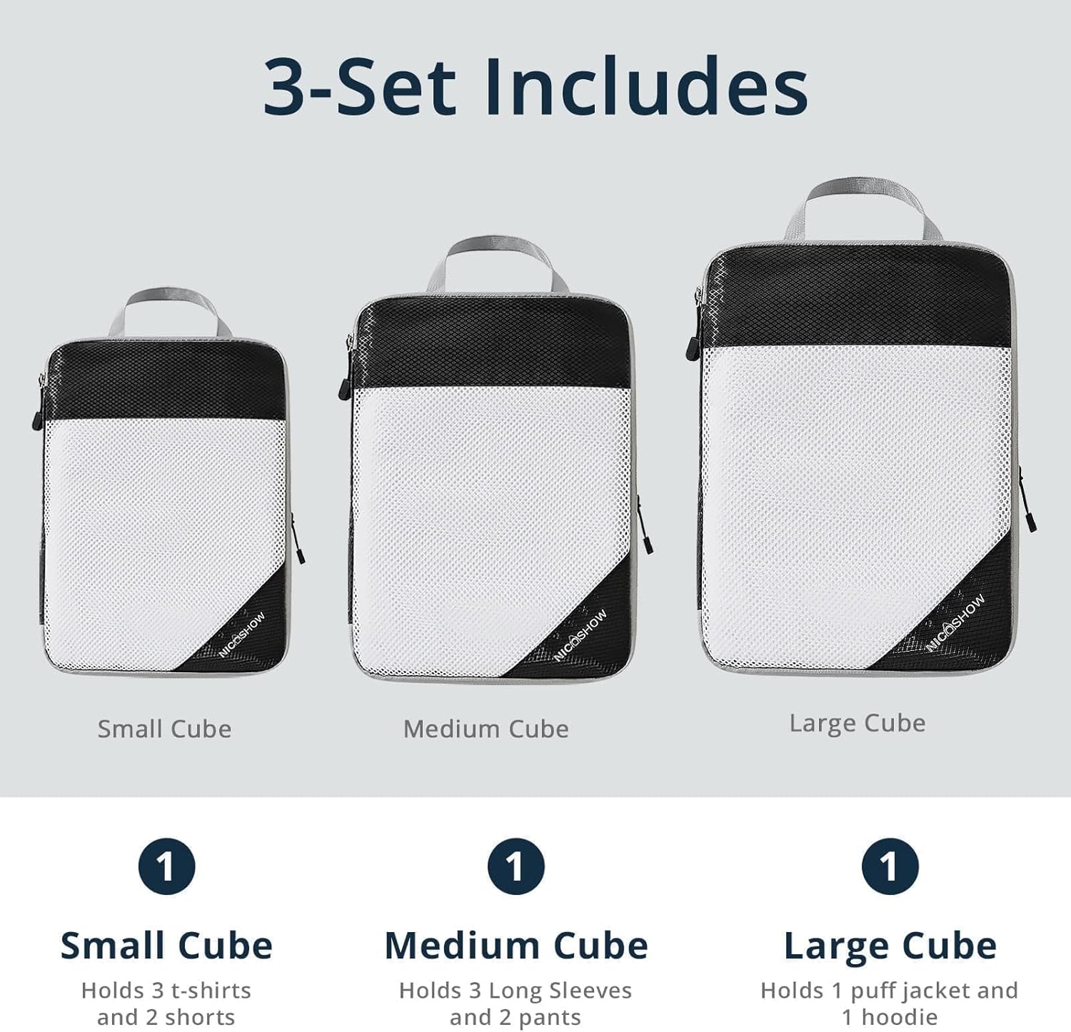 - What Will You Get: NICOSHOW 6-set compression packing cubes for travel include 2 small cubes (12''x8''x4''), 2 medium cubes (14''x10''x4''), 2 large cubes (16''x12''x4'')