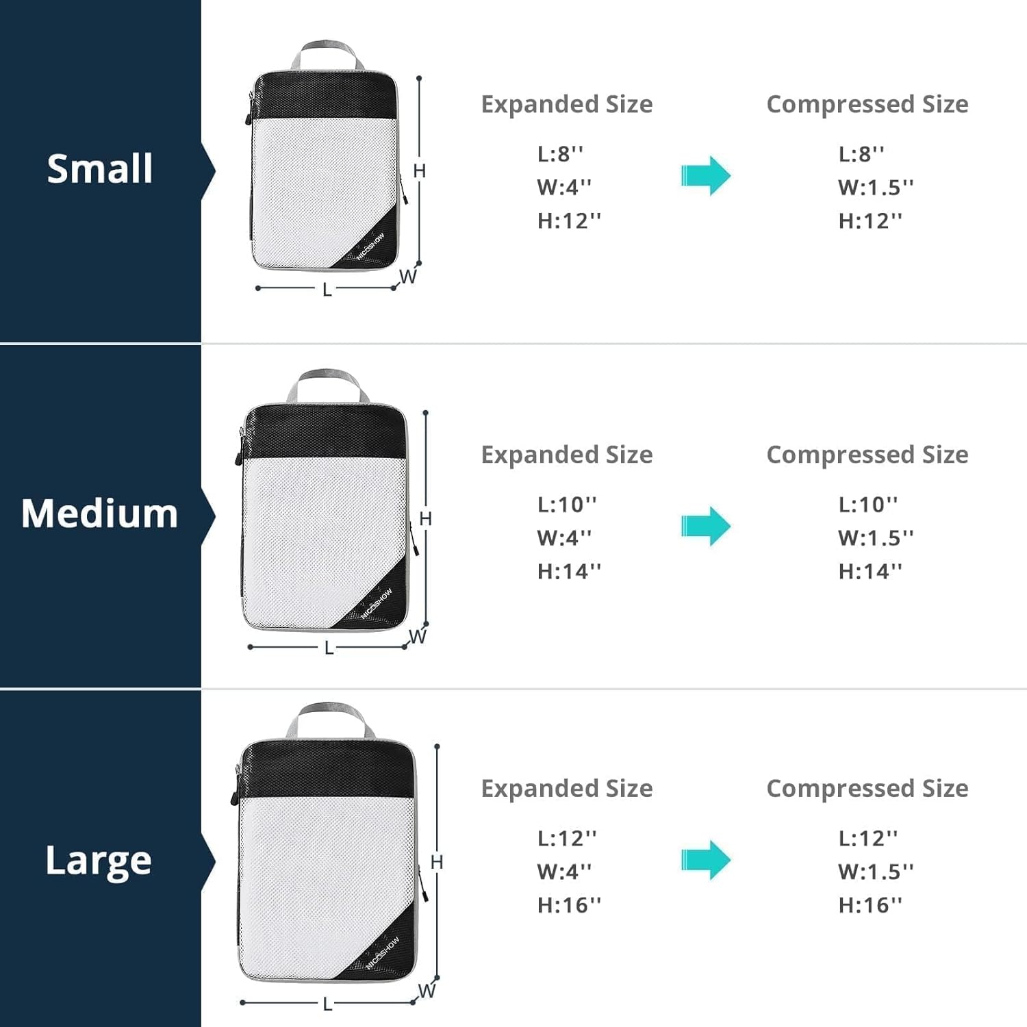 - Organize Like a Pro: These 6-set travel packing organizers contain 6 compressible packing cubes in 3 different sizes. These travel cubes also make it easy to keep luggage organized and tidy. Say goodbye to messy luggage and hello to anti-stress packing