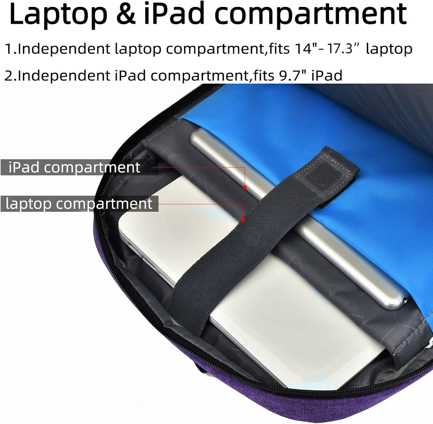 - COMPARTMENT CAPACITY & POCKETS:Separate laptop compartment fits 17/15/14/13 Inch Macbook/Laptop.Separate compartment Fits Maximum 9.7” iPad.Main compartment roomy for tech electronics accessories,3-5 days clothing,5 A4 Books.Front compartment with 2 Pockets for power Bank and Shaver,2 Pen pockets and key fob hook.Pocket for socks and gloves.Front hidden zipper pocket fits papers.2 mesh pockets for water bottle and compact umbrella.Strap pocket fits bus card and Metro Card,One glasses hold strip.