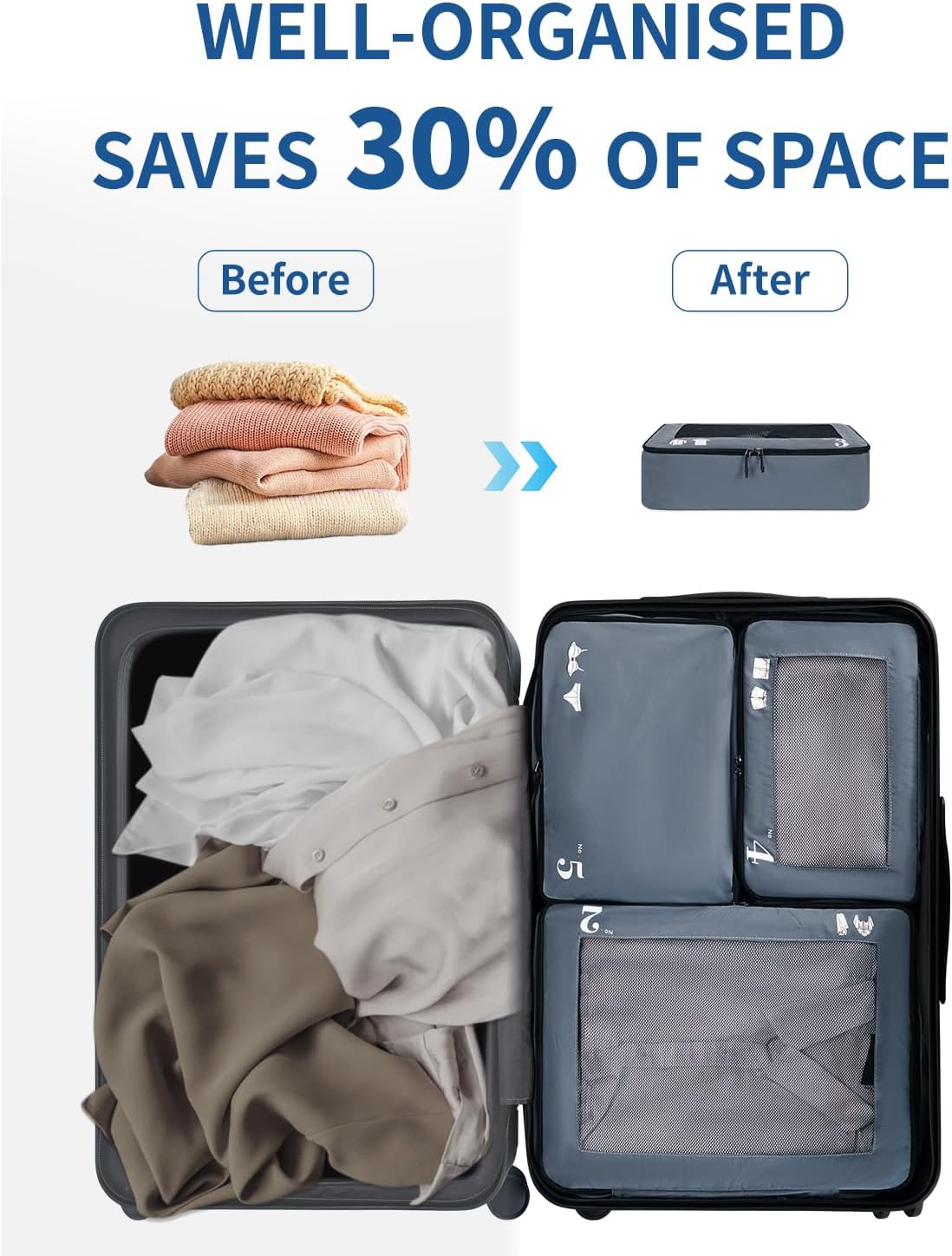 - 【Easily identifiable number and Machine wash】: The number setting is convenient for family members to distinguish their luggage in holiday trips. The simple ICON design can prompt us to put in the corresponding clothes. Unlike traditional packing cubes to be hand wash, our packing bags are machine washable.