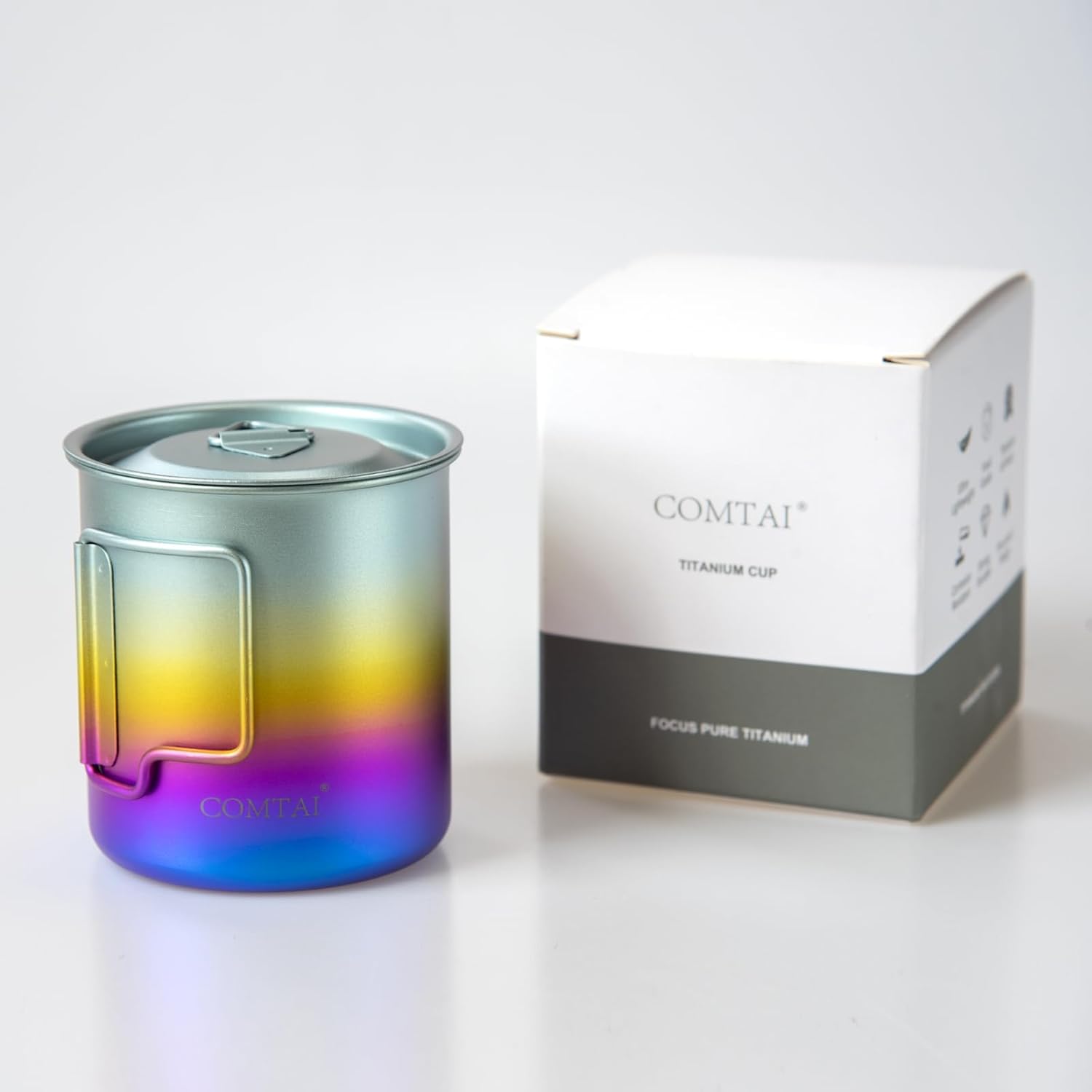 Titanium Camping Pot Mug 15oz (420ml) with Lid and Foldable Handle – Ultralight Camping Cup for Hiking, Backpacking, Outdoor Cooking, Rainbow