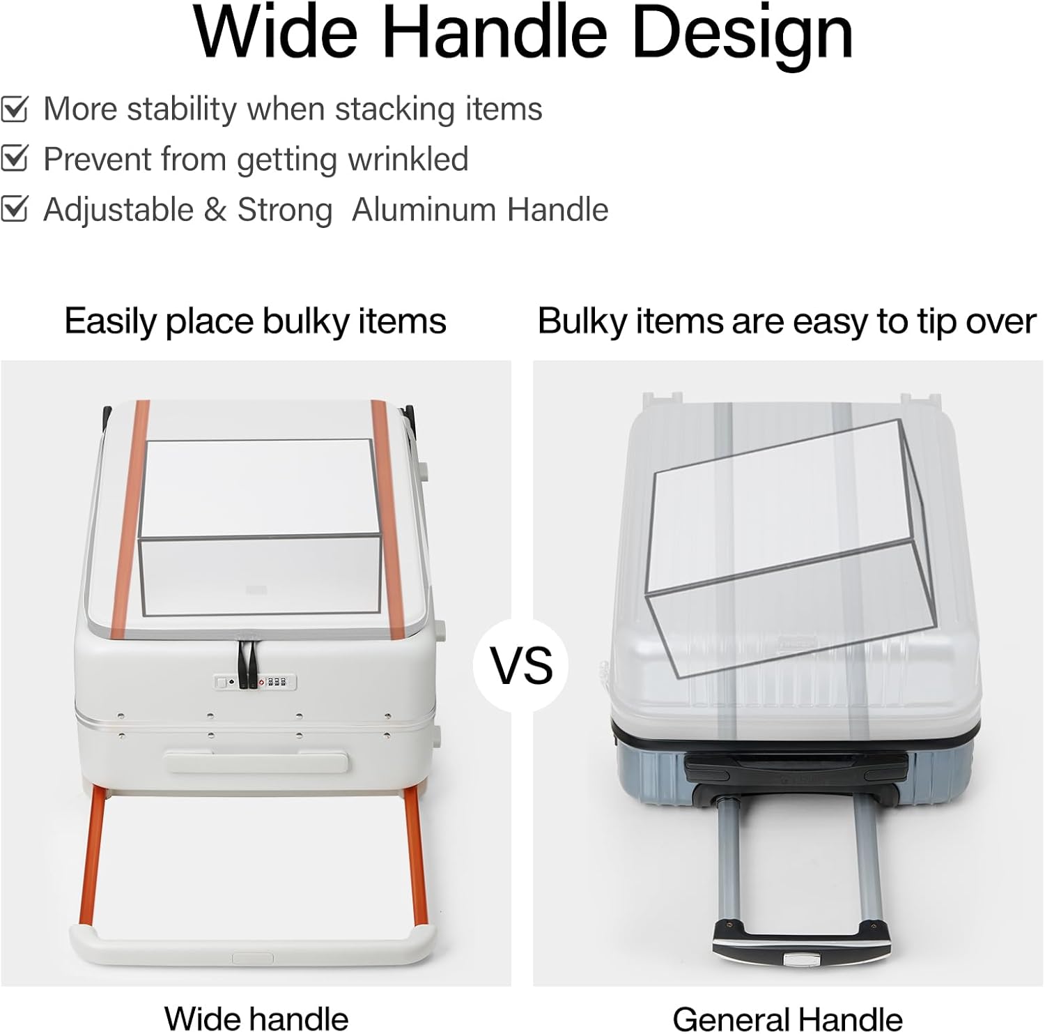 - Wide Handle Design for 13% Extra Packing Space: Wide handles on this zipperless carry-on luggage maximize interior room(ADDING 13% Space) while providing a secure grip for easy maneuvering